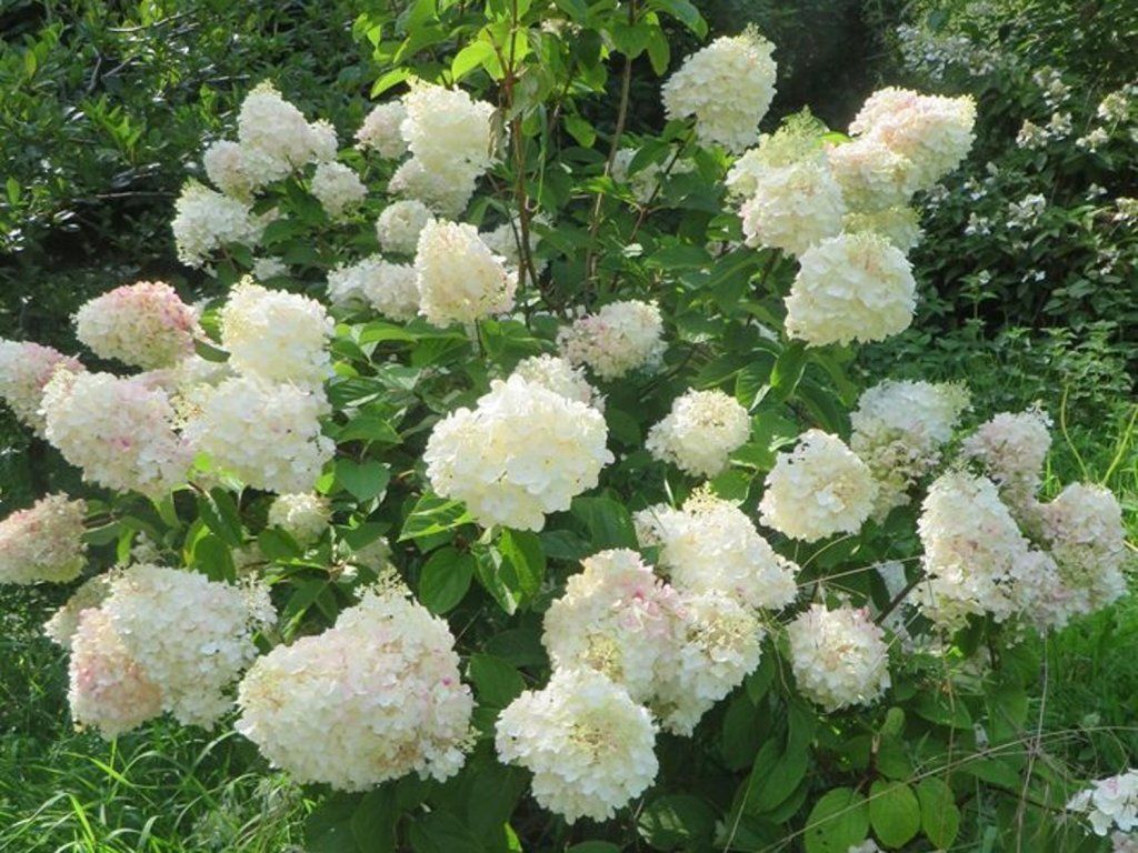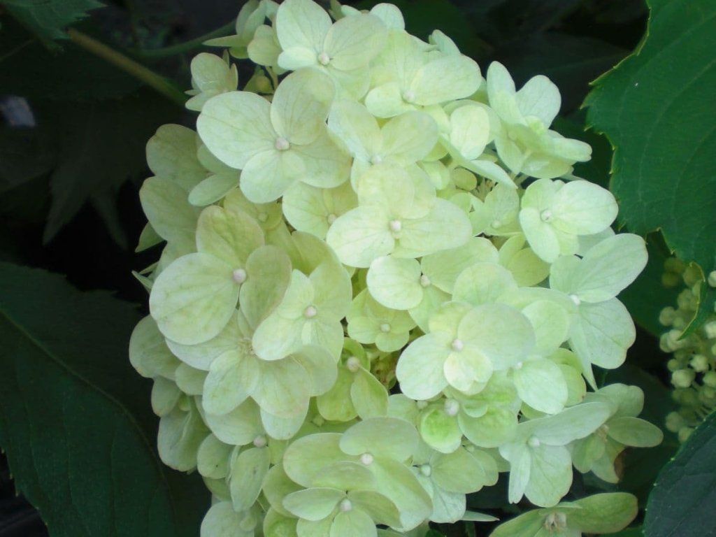 Bauernhortensie 'Silver Dollar' - eine klassische Sorte der Bauernhortensie mit auffälligen, cremeweißen Blütenrispen, die an die Tradition bewährter, zuverlässig blühender Sträucher für Gärten in gemäßigten Zonen anknüpft. Sie stammt von einer Art ab, die aus Ostasien stammt, wo die Bauernhortensie an Waldrändern und in Bergregionen vorkommt, und übernimmt so eine gute Kältebeständigkeit sowie die Fähigkeit, an diesjährigen Trieben zu blühen. Unter unseren Bedingungen bildet sie einen mittelgroßen, aufrechten und gut verzweigten Strauch, der normalerweise 1,5–2 m hoch und 1,2–1,5 m breit wird. Die Triebe sind fest, leicht rötlich und tragen auch bei regnerischem Wetter gut die Blütenrispen. Die Blätter sind eiförmig-lanzettlich, tiefgrün, auf der Unterseite heller, im Herbst können sie gelbliche Farbtöne annehmen. Von Juli bis September trägt die Pflanze große, dichte, kegelförmige Rispen, die hauptsächlich aus sterilen Blüten bestehen. Die Blüten öffnen sich cremeweiß und nehmen allmählich einen zarten rosa bis leicht grünlichen Ton an, je nach Standort und Wetter. Dank ihrer hellen Farbe bringt diese Sorte Leichtigkeit in die Bepflanzung und erhellt auch halbschattige Gartenbereiche. Die Rispen eignen sich zum Schnitt für frische und trockene Gestecke, der Strauch wird als Solitär, in Gruppen sowie in Kombination mit Ziergräsern, Rosen oder immergrünen Gehölzen eingesetzt.