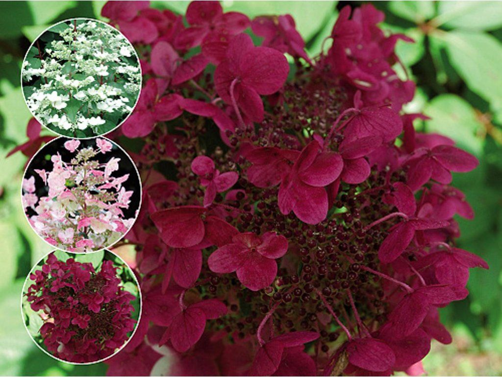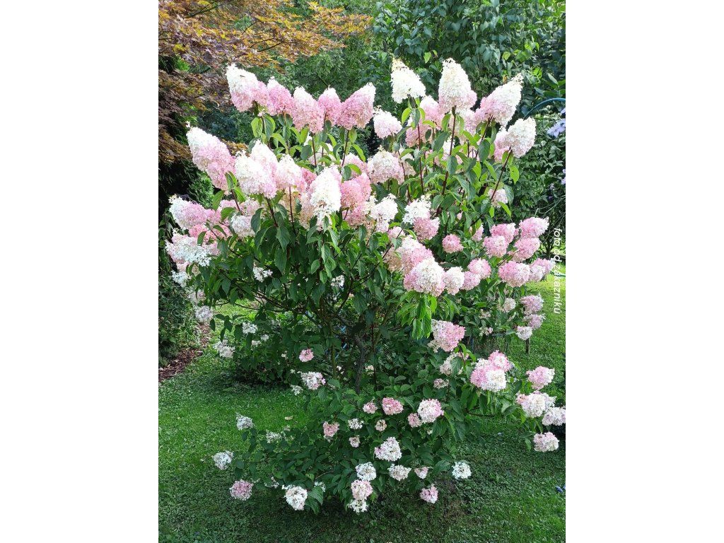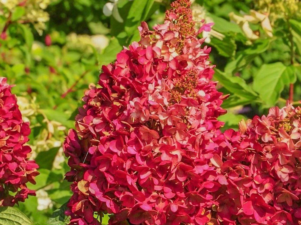 Rispenhortensie 'Wim's Red' - eine der beliebtesten Rispenhortensien. Sie bildet einen dichten, mittelgroßen Strauch, der normalerweise 1,5–1,8 m hoch und 1–1,5 m breit wird, mit fester, leicht aufrechter Verzweigung und ovalen, tiefgrünen Blättern, die im Herbst oft gelbliche bis rötliche Töne annehmen. Im Sommer, normalerweise von Juli bis September, trägt sie große, kegelförmige Blütenstände von bis zu 25 cm Länge, die aus fruchtbaren Blüten und auffälligen sterilen Blüten bestehen. Diese beginnen in der Blütezeit in einem cremeweißen Farbton, gehen allmählich in zarte Rosatöne über und werden am Ende der Saison tiefrot bis weinrot, besonders an einem sonnigen Standort mit kühleren Nächten. Die Blütenstände behalten auch nach dem Verblühen gut ihre Form und werden zum Schnitt für Vasen oder zum Trocknen verwendet. Der Strauch eignet sich hervorragend als Solitär im Rasen, im vorderen bis mittleren Bereich von gemischten Beeten mit Stauden und Ziergräsern, lässt sich gut mit Nadelgehölzen oder immergrünen Laubgehölzen kombinieren und trägt dank seiner attraktiven Blüten zur Anziehung von Bienen und anderen Bestäubern bei. Beim Anbau in Gefäßen schmückt sie Eingänge zu Häusern, Terrassen oder größere Balkone.