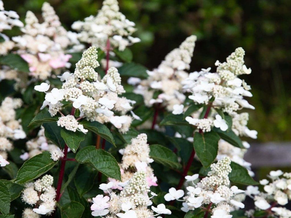 Anbau: Rispenhortensien sind in unseren Gärten sehr beliebt wegen ihrer Anspruchslosigkeit und hohen Frostbeständigkeit, die bis zu –30 °C reicht. Im Gegensatz zu anderen Arten blühen sie an neuem Holz, was bedeutet, dass Frost ihnen im Winter ihre Blüten nicht nimmt. Sie gedeihen am besten an einem sonnigen Standort, wo sie am intensivsten blühen, vertragen aber problemlos auch Halbschatten. Hinsichtlich des Bodens sind Rispenhortensien sehr anpassungsfähig und benötigen kein ausgesprochen saures Substrat; sie gedeihen am besten in leicht saurer bis neutraler, humoser Erde, die Feuchtigkeit gut speichert, aber nicht dauerhaft vernässt ist. Im Gegensatz zu Bauernhortensien beeinflusst der pH-Wert hier die Blütenfarbe nicht. Diese ändert sich natürlich mit dem Alter der Blüte und dem Absinken der Temperaturen, wobei der endgültige Farbton von der jeweiligen Sorte abhängt. Während einige Sorten bis zum Herbst schneeweiß oder limettengrün bleiben, färben sich andere zartrosa und wieder andere, wie zum Beispiel 'Vanilla Fraise' oder 'Wim's Red', gehen in tief weinrote Töne über. Ausreichende Feuchtigkeit ist entscheidend, daher ist eine regelmäßige und ausgiebige Bewässerung erforderlich, insbesondere in den Sommermonaten, wobei der Boden zwischen den Wassergaben nur leicht antrocknen sollte. Idealerweise sollte die Oberfläche um die Sträucher herum mit Rinde oder Hackschnitzeln gemulcht werden, was die Wurzeln vor Überhitzung schützt und die Verdunstung reduziert. Gedüngt wird vom Frühjahr bis Mitte Sommer mit Düngemitteln für blühende Gehölze oder Kompost, aber ab August wird die Stickstoffzufuhr reduziert, damit die Triebe bis zum Winter verholzen können. Grundlegend für den Erfolg ist ein tiefer Frühlingsschnitt, der im Vorfrühling durchgeführt wird, normalerweise Ende Februar oder im März, wobei die letztjährigen Triebe auf zwei bis drei Knospenpaare gekürzt werden. Dies sorgt für einen dichten Strauch, feste Stiele und große Blütenstände. Beim Anbau in Behältern ist es notwendig, ausreichend große Töpfe mit Abfluss und hochwertige, humose Erde zu wählen, wobei es ratsam ist, den Behälter für den Winter zu isolieren. Zur Vorbeugung gegen Krankheiten und Schädlinge sind vor allem ein luftiger Standort und eine Bewässerung, die direkt auf die Wurzeln und nicht auf die Blätter gerichtet ist, wichtig.