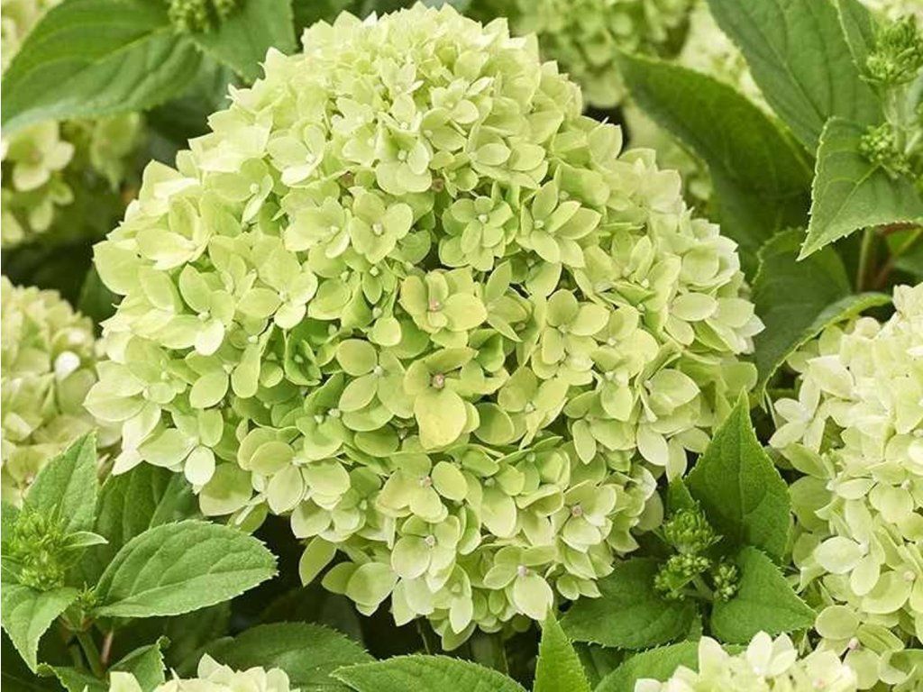 Rispenhortensie LIVING LITTLE APPLE - sehr attraktive neue Hortensiensorte, die sich durch ihre interessant gefärbten Blüten auszeichnet. Im ausgewachsenen Zustand erreicht der Strauch eine Höhe von etwa 60 - 70 cm und eine ähnliche Breite. Die Blüten sind in einer runden Blüte gruppiert und haben eine grüne Farbe. Daher erhielt die Sorte den Spitznamen "Kleine Äpfel", dem ihre Blüten optisch ähneln. Sie erscheinen von Juli bis August. Die Blätter sind herzförmig mit einer ausgeprägten Spitze und haben eine dunkelgrüne Farbe. Sie fallen im Winter ab. Insgesamt ist die Hortensie ein beliebtes Element für Gärten und verleiht jedem Garten ein zartes und romantisches Aussehen.
