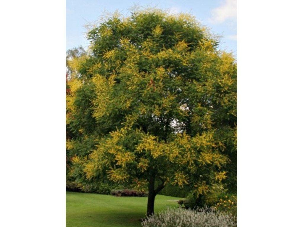 Koelreuteria paniculata - ein laubabwerfender Baum aus China, Japan und Korea. Er erreicht eine Höhe von etwa 8-10 Metern und hat eine ausladende Krone, die eine ähnliche Breite erreichen kann. Der Habitus dieses Baumes ist vielfältig und ansprechend. Seine Krone ist meist breit-kugelförmig bis unregelmäßig-oval, was ihm ein elegantes Aussehen verleiht. Das Wachstum ist mittelschnell, was die Erreichung einer ausreichenden Höhe und Breite innerhalb weniger Jahre ermöglicht. Die Blätter von Koelreuteria paniculata sind wechselständig und bestehen aus mehreren kleineren Blättchen. Sie treiben im Frühling aus und ähneln in ihrer Form feinen Farnen. Sie treiben bronzefarben-rosa aus, sind im Sommer frischgrün und färben sich im Herbst feurig-orange und dann goldgelb. Ihre Herbstfärbung ist wunderschön und reicht von gelbgrün bis zu orange und roten Farbtönen. Die Blüten dieses Baumes sind auffällig, leuchtend gelb und erscheinen an den Astenden. Die Blüten blühen Ende Juli und Anfang August, was eine wunderschöne Ansicht bietet, wenn der Großteil des Gartens bereits verblüht ist. Sie bieten eine wertvolle Nektarquelle für ein breites Spektrum von Bestäubern. Die Früchte sind runde Kapseln, die an kleine Lampions erinnern und nach der Reife eine auffällige orange-aprikosenfarbene Färbung annehmen. Sie ähneln in ihrem Aussehen kleinen Chilis. Bei Reife platzen die Früchte auf und geben die Samen frei. Dies ist ein idealer Baum für städtische Umgebungen, kleinere Gärten und eignet sich besonders für Dachgärten und große Terrassen.