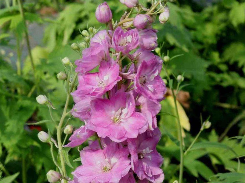 Rittersporn 'Pacific-Serie Astolat' - eine Rittersporn-Art aus der bekannten Pacific Giant-Gruppe, die in den 1930er und 1940er Jahren in Kalifornien von Frank Reinelt gezüchtet wurde und später auch als Benary’s Pacific-Selektion verbreitet war. Die Pflanze bildet eine bodennahe Rosette aus tief geteilten Blättern, und zur Blütezeit wachsen kräftige Stängel, die normalerweise 1,5–1,8 m hoch werden, bei einer Horstbreite von etwa 0,6–0,8 m. Von Juni bis August öffnen sich nach und nach von unten große, halbgefüllte Blüten in Rosa- bis Lilatönen, oft mit einem kontrastierenden „Auge“ in der Mitte, der die Blütenzeichnung auch aus der Ferne hervorhebt. Die Blüten werden von Hummeln und Bienen gesucht, und die langen Stiele gehören zu den traditionellen Schnittblumen für Sommersträuße. Die gesamte Pflanze ist beim Verzehr giftig und der Saft kann die Haut reizen, daher sind bei der Handhabung Handschuhe ratsam. In der Komposition wirkt sie am besten im Hintergrund von Beeten mit Rosen, Pfingstrosen, Schafgarben, Flammenblumen und Ziergräsern, wo sie ein vertikales Gegengewicht zu üppig belaubten Stauden bildet. Dank ihrer Farbe und Form sind die Blüten auch in der Vase sehr beliebt. Sie ist die ideale Wahl für jeden, der seinem Garten ein elegantes vertikales Element in intensiven Farben hinzufügen möchte. Ihre kompakte Größe macht sie leicht in kleineren Gärten oder an den Rändern von Beeten einsetzbar.
