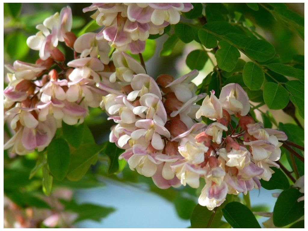 Falscher Jasmin, Akazie 'Hillieri' - lLaubbaum oder großer Strauch mit offener, abgerundeter Wuchsform. Er wächst bis zu ca. 10 Meter in die Höhe und 6 Meter in die Breite. Die Blätter sind dunkelgrün und gefiedert, sie bestehen aus bis zu 19 Blättchen. Im Frühling werden sie von hängenden, zartrosa Blüten mit angenehmem, intensivem Duft ergänzt. Danach folgen lange braune Hülsen mit Samen. Die Äste sind mit kleinen Dornen bedeckt. Geeignet für alle Gärten, die vor scharfen und starken Winden geschützt sind.