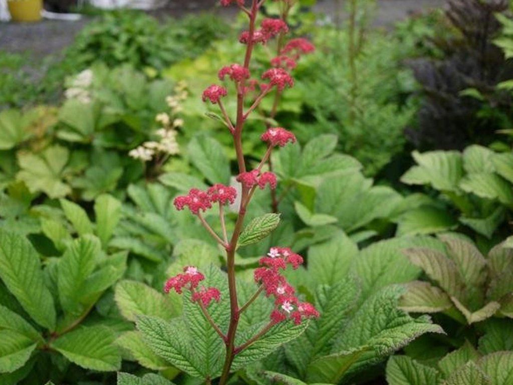 Rodgersia henrici - eine interessante Staude, deren Blätter an ein Kastanienblatt erinnern. Die Blätter sind im Frühjahr rötlich, später werden sie grün. Die Blüte ist rot. Sie erreicht eine Höhe von 80-100 cm (einschließlich Blüte). Eher für Halbschatten und Schatten geeignet.