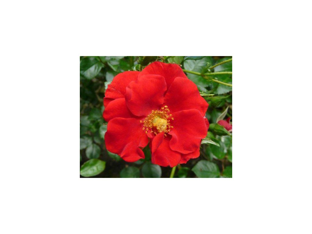 Rose 'Alpenglühen®' - Bodendeckerrose, wächst breit, buschig und verzweigt. Sie erreicht eine Höhe von 80 cm. Blüht von Juni bis September mit leuchtend roten Blüten. Die Blüten sind klein, aber sehr intensiv gefärbt mit gelber Mitte. Ein schöner Farbkontrast wird durch glänzende, gezackte grüne Blätter unterstrichen.