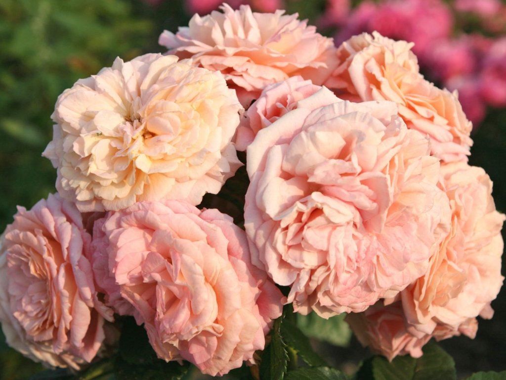 Rose 'Amaretto®' - Floribunda-Rose des deutschen Züchters Kordes, erhielt die ADR-Auszeichnung 2016 für außergewöhnliche Vitalität und Blattgesundheit. Der Strauch wächst aufrecht, kompakt und verzweigt sich gut, im ausgewachsenen Zustand erreicht er eine Höhe von 70-90 cm und eine Breite von 50-60 cm. Die Blätter sind dunkelgrün, ausgeprägt glänzend und wirken stets gepflegt. Die Blüten sind voll, kugelig-schalenförmig, im Durchmesser 6-7 cm, in wechselnder Pastellfärbung von Rosa, Lachs und hellem Apricot. Der Duft ist zart. Sie blüht wiederholt in einer langen Blühperiode von Juni bis Oktober, die Blüten halten sich an kräftigen Stielen und vertragen Regen gut. In der Komposition kommt sie in den vorderen Bereichen von gemischten Staudenbeeten, in niedrigen Einfassungen oder als Solitärpflanze im Kübel auf der Terrasse zur Geltung. Sie wirkt natürlich mit blauvioletten und graulaubigen Begleitpflanzen, zum Beispiel mit Lavendel, Wiesensalbei, Storchschnabel oder Schwingel.