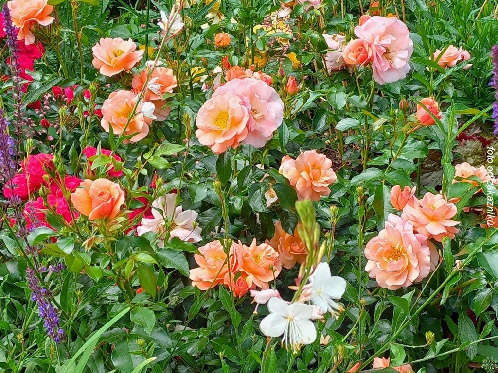 Rose 'Aprikola®' - deutsche Floribunda-Rose aus der Züchtung von W. Kordes’ Söhne, seit 2000 auf dem Markt und mit dem ADR-Prädikat für Gesundheit und Zuverlässigkeit ausgezeichnet. Sie wächst strauchartig und kompakt, im ausgewachsenen Zustand erreicht sie eine Höhe von ca. 70-90 cm und eine Breite von 50-70 cm. Die Blätter sind dunkelgrün, ledrig und glänzend. Die Blüten erscheinen in reichen Büscheln, durchschnittlich 6-8 cm groß, die Farbe schwankt zwischen Aprikot und Lachsrosa mit feinen Übergängen je nach Temperatur und Sonneneinstrahlung. Die Struktur ist halbgefüllt bis gefüllter, mit guter Regenbeständigkeit und ohne Neigung zur Blaufärbung des Farbtons. Der Duft ist leicht, fruchtig. Die Blütezeit erstreckt sich von Juni bis Oktober, bei kontinuierlicher Entfernung verblühter Blüten. Dank ihres kompakten Wuchses eignet sie sich für Gruppenpflanzungen, an den Rändern von Staudenbeeten, im Vordergrund höherer Rosen und Stauden, an niedrigen Hängen sowie in Kübeln auf sonnigen Terrassen. Farblich harmoniert sie mit blauvioletten und silbrigen Stauden des Spätsommers wie Katzenminze, Indianernessel, Fetthenne, Federgras oder Schwingel. Eine offenere Blüte in der ersten Blütephase ermöglicht den Zugang für Bestäuber.