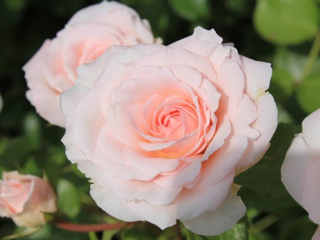 Rose 'Bremer Stadtmusikanten®' - ein Strauchrosen-Kultivar aus deutscher Züchtung von W. Kordes’ Söhne, um das Jahr 2000 im Rahmen der romantischen Serie MärchenRosen eingeführt. Bildet einen dichten, aufrechten Strauch von etwa 100-120 cm Höhe und 70-80 cm Breite. Die Triebe sind mitteldick, leicht bogenförmig gebogen, mit typischen Rosendornen. Das Laub ist dunkelgrün, glänzend und gesund, im Frühjahr frischer, im Sommer bildet es einen ruhigen Hintergrund für die Blüten. Die Blüten gehören zu den markanten Merkmalen dieses Kultivars – sie sind groß, etwa 7-9 cm im Durchmesser, voll, schalenförmig, mit Blütenblättern, die in einer kamelienähnlichen Form angeordnet sind. Die Grundfarbe ist cremig bis hellrosa, die Mitte ist intensiver, rosafarbener, was einen sanften Farbverlauf erzeugt. Sie erscheinen in kleinen bis mittelgroßen Büscheln an den Triebspitzen, bei guter Pflege bedecken sie den Strauch in wiederholten Wellen von Juni bis Oktober, in wärmeren Gebieten bis zu den ersten Frösten. Der Duft ist leicht, süßlich, am stärksten an warmen Tagen bei frisch geöffneten Blüten wahrnehmbar. Die Rose zieht bestäubende Insekten eher in geringem Maße an, da die Blüten stark gefüllt sind, aber bei teilweiser Öffnung des Zentrums Pollen bieten. Der Kultivar eignet sich als romantische Solitärpflanze in kleineren Gärten, in Gruppen von drei oder mehr Stück in gemischten Beeten, in niedrigen Hecken oder in Kombination mit anderen Rosen in zarten Pastellfarben. Wirkt gut mit Katzenminze, Lavendel, Salbei oder niedrigeren Ziergräsern, die die Blüten und die Form des Strauchs hervorheben.