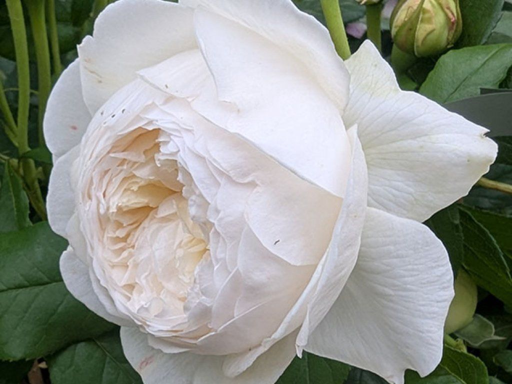 Rose 'Claire Austin®' - eine charmante englische Kletterrose. Sie erreicht eine Höhe von etwa 2,5 bis 3,5 Metern und eine Breite von 1,0–1,5 Metern. Die Blüten haben eine wunderschöne cremeweiße Farbe, die Blütenblätter sind zu einer eleganten Schale angeordnet. Die Sorte blüht wiederholt von Juni bis zu den ersten Frösten. Der Duft der Blüten ist intensiv nach Myrrhe, ergänzt durch Noten von Vanille, Heliotrop und Honig. Die Sorte ist ideal für Bereiche mit Stützen, wie z. B. Bögen, Mauern, Pergolen oder Säulen. Sie kommt auch wunderbar als Mittelpunkt des Gartens oder als markantes vertikales Element zur Geltung.