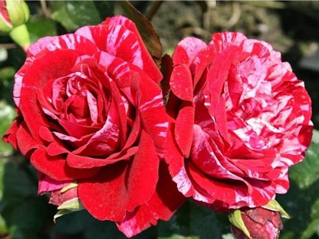 Rose 'Deep Impression®' - Strauchrose, wächst bis zu 70-100 cm hoch, mit einer sehr interessanten Blüte - die Grundfarbe ist rot, in den oberen Blütenbereichen wechseln sich Streifen in Rosa und Weiß ab.