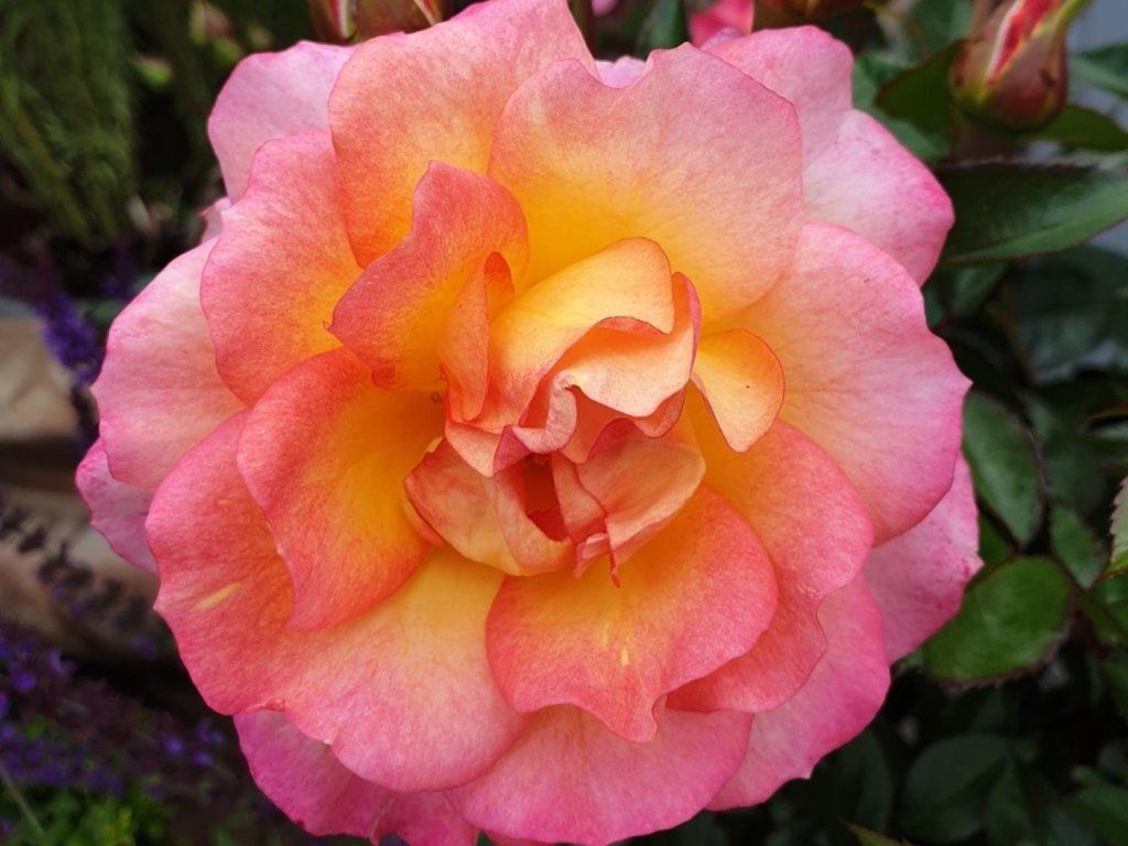 Rose 'Dekora®' - gefüllte Rose, wächst in dichten aufrechten Büschen. Erreicht eine Höhe von etwa 120 cm. Blüht wiederholt bis zum ersten Frost. Ihre Blüten sind überwiegend rosa, zur Mitte hin gehen sie in goldene Töne über. Im Kontrast dazu stehen tiefgrüne, glänzende und gesägte Blätter. Gehört zu den Neuheiten, gezüchtet im Jahr 2021. Dank fester Blütenblätter eignet sie sich hervorragend zum Schnitt für die Vase. Sie hält sich darin lange. Sie zeichnet sich durch eine hohe Widerstandsfähigkeit gegen Frost und Krankheiten aus.