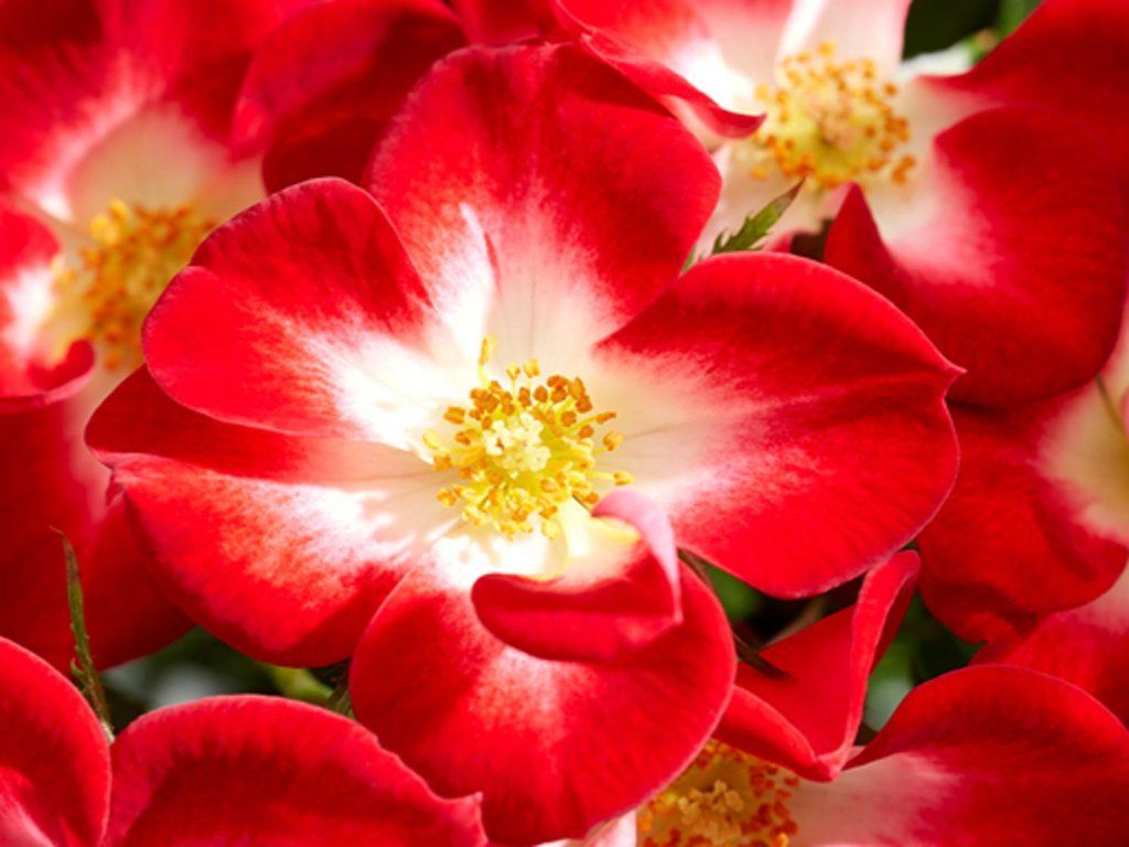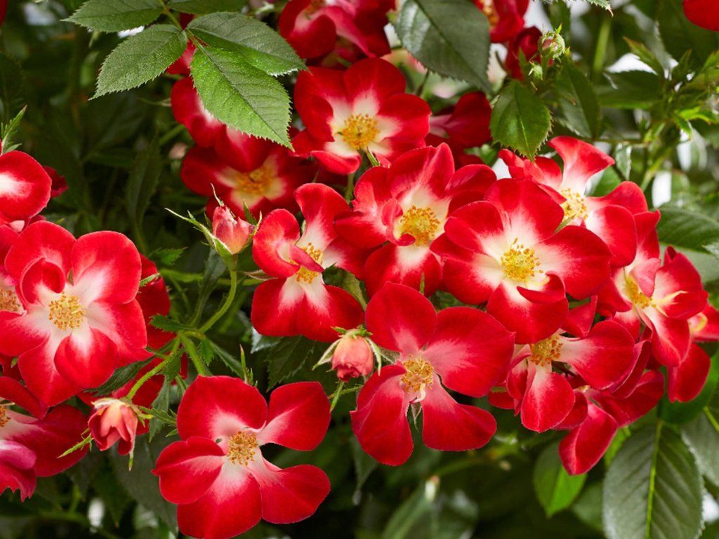 Rose ´Everglow Ruby´ - kompakter Strauch, der eine Höhe von 0,6 - 0,8 m bei einer Breite von 0,4 - 0,5 m erreicht. Die Blätter sind glänzend und grün. Blüten von einfacher Form, mit leicht gewellten Blütenblättern. Sie haben eine leuchtende, tiefrote Farbe, in die sich von innen Weiß mischt. Sie blühen von Juli bis September. Die Pflanze ist auch für die Kultivierung in Behältern geeignet. Frostbeständigkeit bis -18°C. Die Sorte ist für kleinere Gärten oder Beete geeignet.