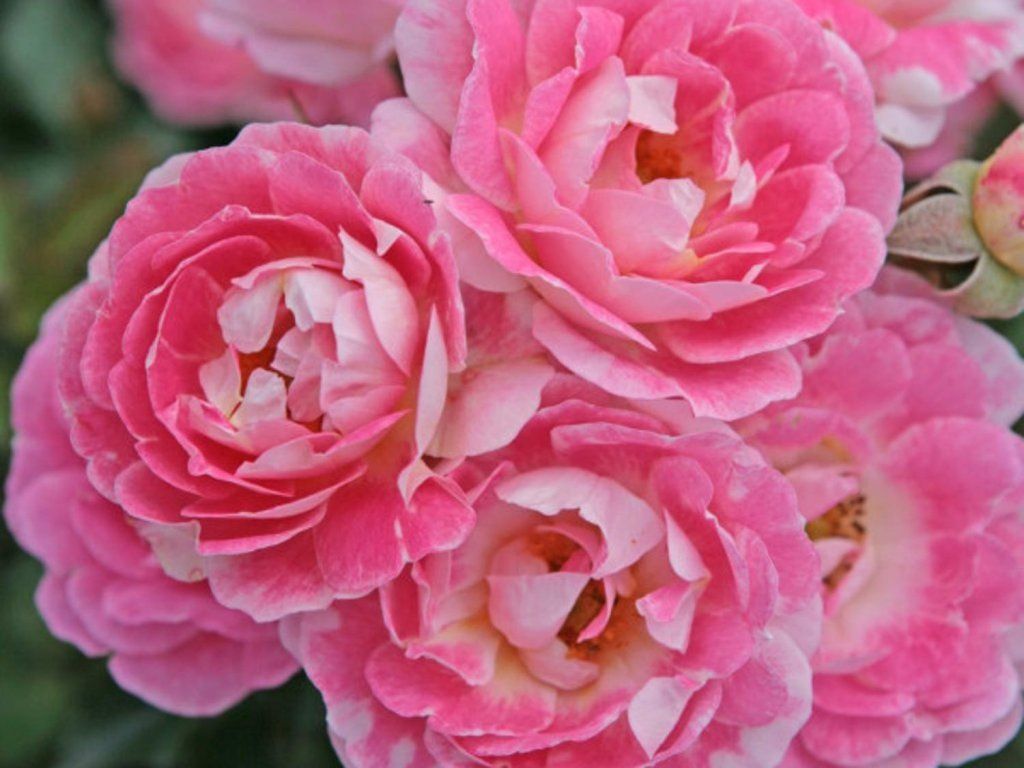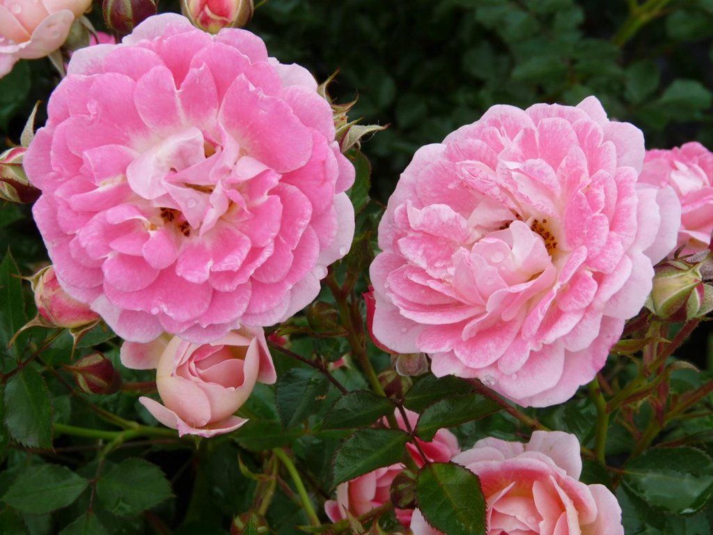 Rose 'Flirt 2011®' - kompakt wachsend, nur 50 cm hoch und 40 cm breit werdend. Die Blütenpracht ist üppig und in einem zarten Rosa gefärbt. Sie blüht den ganzen Sommer über immer wieder. Die Blätter sind dunkelgrün, glänzend und bilden einen hervorragenden Kontrast zu den Blüten. Sie eignet sich für jede Gruppenbepflanzung, kommt aber am besten als Solitärpflanze zur Geltung, die auch im Kübel angebaut werden kann. Sie ist gut frost- und krankheitsresistent. Sie trägt die ADR-Auszeichnung.