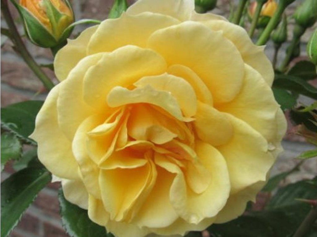 Rose 'Foxtrot Courtyard®' - eine Kletterrose, die 2-3 m hoch wird. Sie ist buchstäblich übersät mit kleineren, halbgefüllten Blüten mit einem Durchmesser von 5-8 cm in leuchtend gelber Farbe. Sie blüht die ganze Saison über wiederholt.