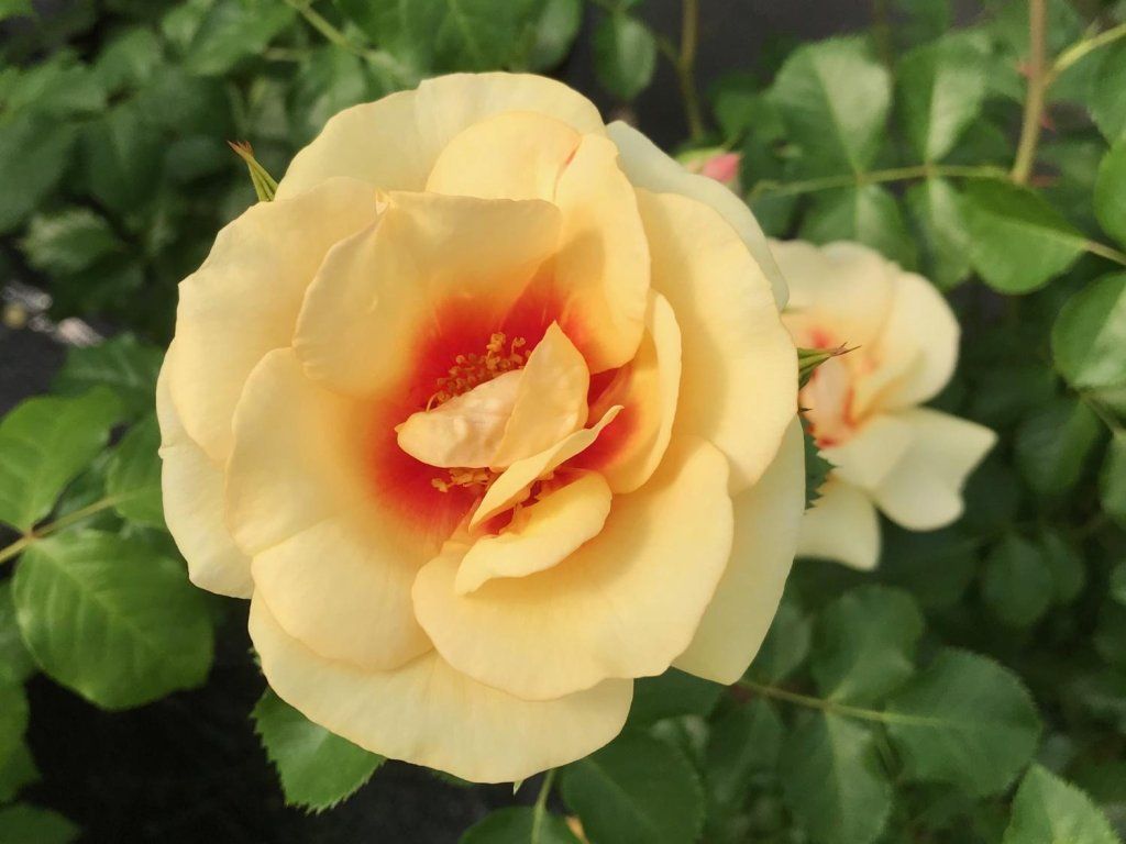 Rose 'Looking for Romance' - eine neue Sorte der beliebten Rose, die einen ordentlichen, kompakten Strauch bildet, der bis zu 90 cm hoch und 80 cm breit wird. Sie zeichnet sich durch üppige Blüten aus, die von Juni bis September wiederholt an der Pflanze erscheinen. Die weit geöffneten, mittelgroßen Blüten sind pastellgelb mit einem kontrastierenden Fleck in der Mitte der Blütenblätter. Die mittelgrünen Blätter unterstreichen perfekt das frische Aussehen der Pflanze. Sie eignet sich für jede Gruppenbepflanzung oder einzeln als Solitärbusch. Sie ist auch ideal für die Kultur im Kübel.