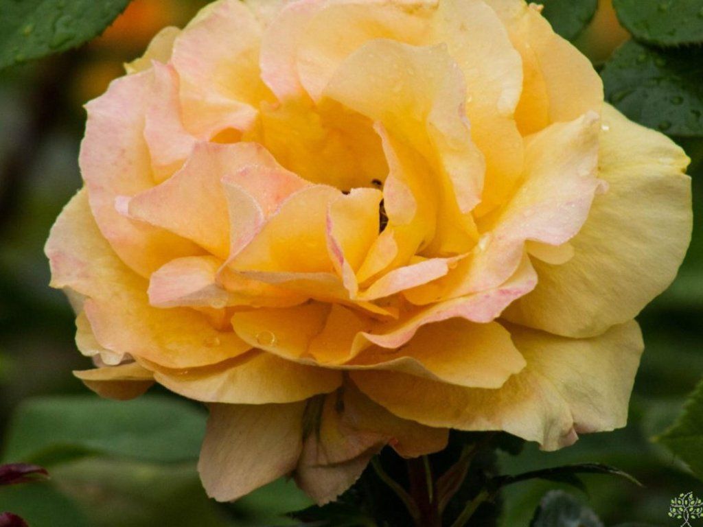 Rose 'Malbork Castle®' - vollblühende Sorte mit wunderschönen, tiefgelben bis leicht orangen Blüten mit einem Durchmesser von 8-10 cm. Die Blätter sind dunkler und bilden einen schönen Kontrast zu den leuchtenden Blüten. Sie wächst auf eine Höhe von 70-90 cm. Die Pflanze ist sehr widerstandsfähig gegen gängige Rosenerkrankungen.