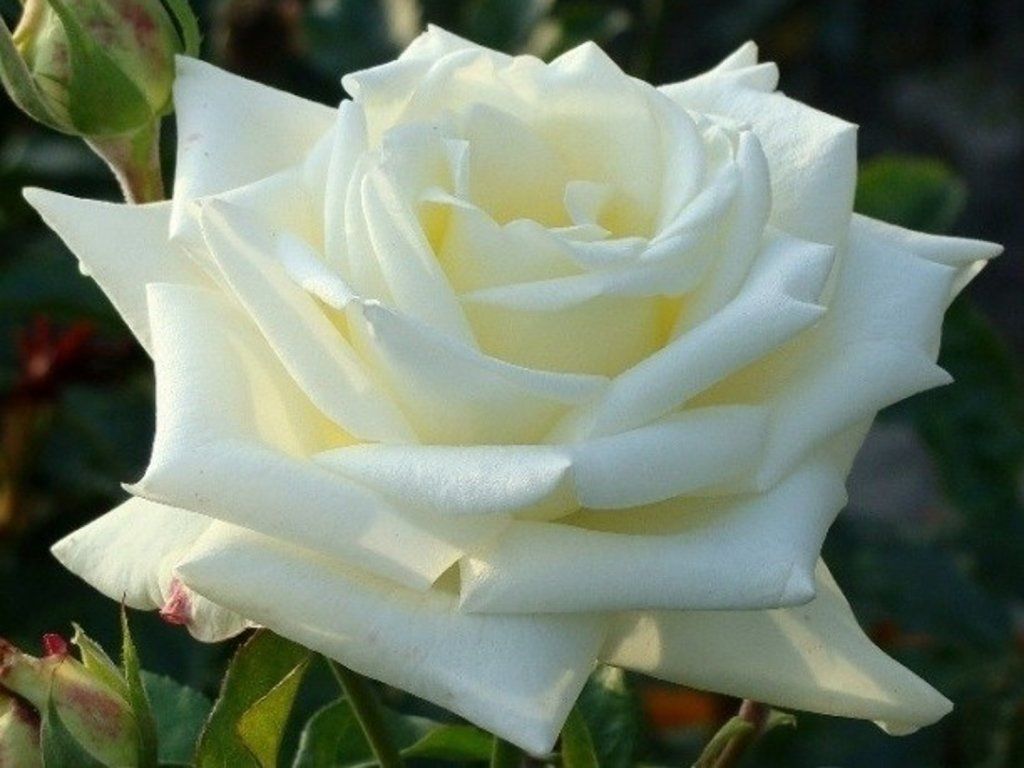 Rose 'Mount Shasta' - eine großblütige Rose, die etwa 100 cm hoch wird. Die Blüten sind voll, elegant weiß und duften sehr angenehm. In ihrer Form sind sie typisch für Rosen. Dunkelgrüne, glänzende Blätter ergänzen sie perfekt. Sie eignet sich zum Schnitt und für die Gruppenpflanzung. Die Frosthärte ist gut, ebenso die Krankheitsresistenz. Sie kommt in Kombination mit zarten Rosentönen oder im Vordergrund von Zierhölzern zur Geltung.