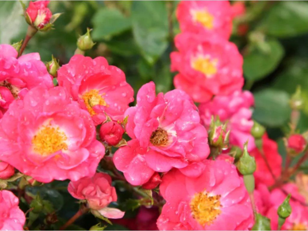 Rose 'Nervia' - eine Floribundarose mit reicher Blüte und robustem Charakter, ideal zur Bedeckung größerer Flächen, Hänge oder zur Einfassung von Wegen und Beeten. Sie bildet einen niedrigen, ausladenden Busch mit dichtem, glänzend grünem Laub, das sehr gesund ist und Krankheiten gut widersteht. Sie erreicht eine Höhe von 40-60 cm bei ähnlicher Breite. Sie blüht ununterbrochen vom späten Frühjahr bis zum Herbst mit einfachen bis halbgefüllten Blüten in zartrosa Farbe, die frisch und natürlich wirken. Die Blüten ziehen Bienen und andere Bestäuber an und bilden einen schönen Kontrast zum dunklen Laub. Sie überwintert auch in kälteren Regionen problemlos. Sie ist die ideale Wahl für alle, die eine pflegeleichte, aber wirkungsvolle Rose mit natürlichem Aussehen suchen, die den Garten die meiste Saison über schmückt.