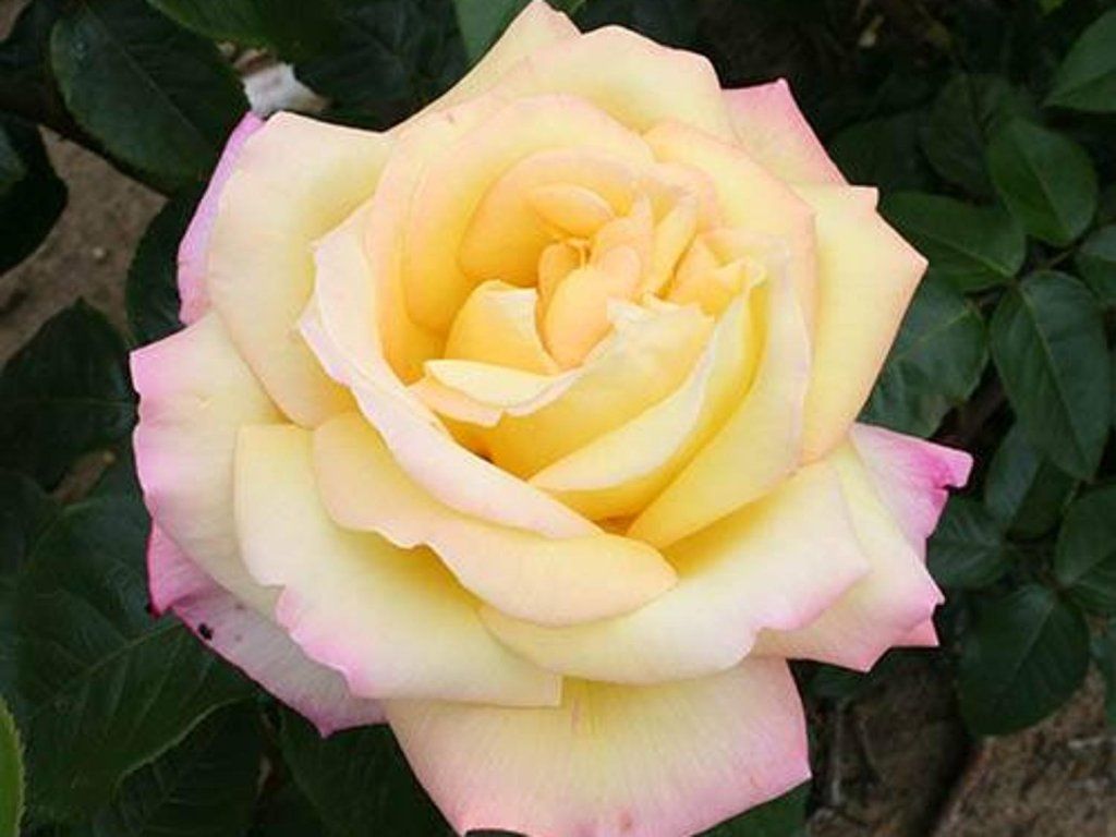 Rose 'Peace' - eine schöne Rose, die bis zu 120 cm hoch wird. Sie ist sehr resistent gegen Frost und Krankheiten. Die Blüten sind groß, im Durchschnitt 10-12 cm. Die Rose ist schon interessant, wenn sie Knospen trägt. Ihre volle Schönheit zeigt sie dann zur Blütezeit, diese erstreckt sich über den ganzen Sommer, sie blüht wiederholt. Auf den Blütenblättern vereinen sich Töne von Beige und Gelb, die Ränder sind dann himbeerfarben. Als Bonus duftet sie sehr stark und süß. Einfach eine perfekte Kombination für Ihren Garten.