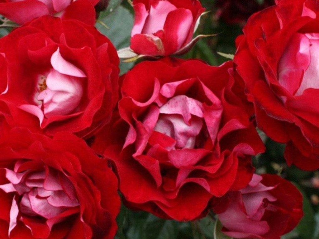 Rose 'Rose der Einheit®' - eine Polyantha-Rose, die zu den schönsten Kultivaren zählt. Sie erreicht eine Höhe von etwa 70 cm. Die Blüten sind romantisch rot gefärbt, die Außenseite der Blütenblätter ist leuchtend weiß. Sie kommt gut in Kombination mit anderen Stauden oder als Solitär zur Geltung.