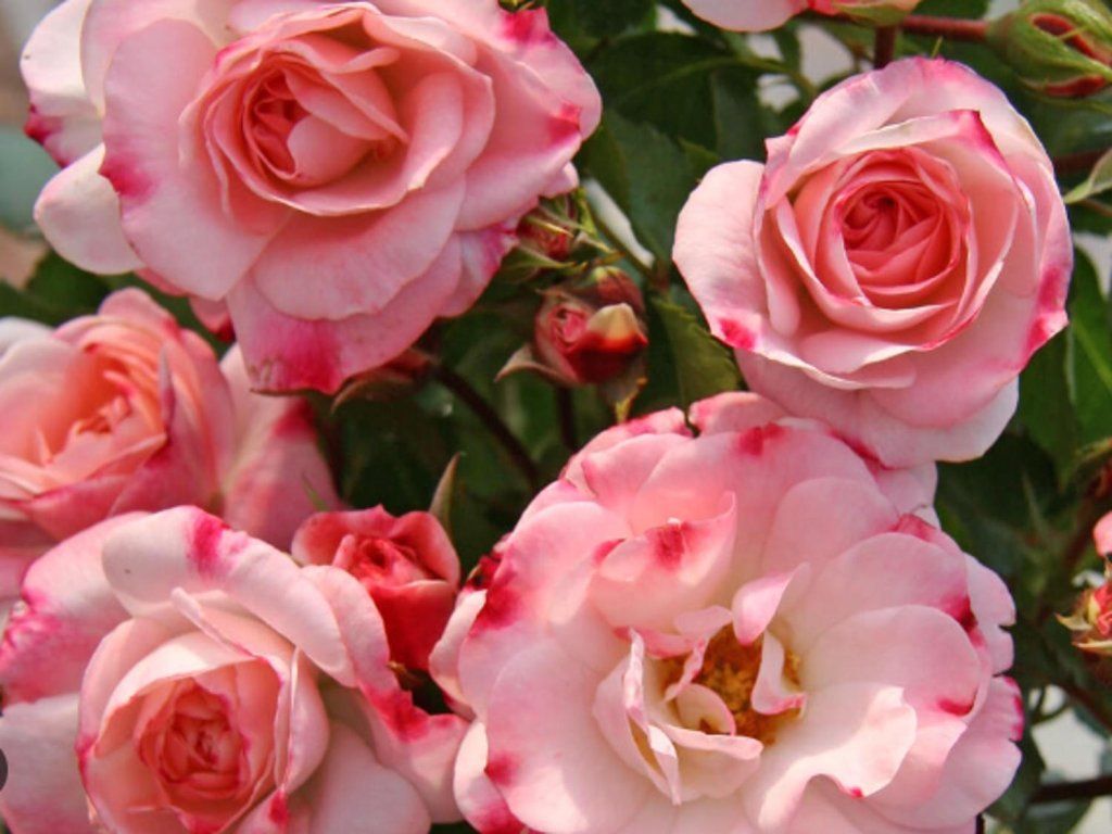 Rose 'Rosenstadt Freising®' - bezaubernde Beetrose, die bis zu 120 cm hoch wird. Sie blüht den ganzen Sommer bis in den Herbst hinein wiederholt mit halbgefüllten, zarten Blüten. Sie sind rot-weiß gefärbt und verfärben sich allmählich rosa. Die Blüte selbst hat einen Durchmesser von etwa 7 cm. Die Rose eignet sich zum Schnitt und ist sehr widerstandsfähig gegen Frost und Krankheiten. Sie trägt die ADR-Auszeichnung. Sie duftet schwach, aber sehr angenehm. Die Blätter sind dunkelgrün und leicht gezahnt.