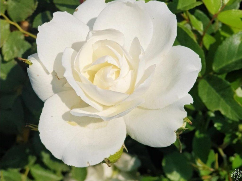 Rose 'Schneewittchen' - eine polymorphe Rose, die bis zu 100 cm hoch wird. Sie hat wunderschöne, reinweiße Blüten, die von Juni bis September erscheinen. Die Sorte blüht sehr reichlich, ist praktisch anspruchslos und auch für Anfänger geeignet.