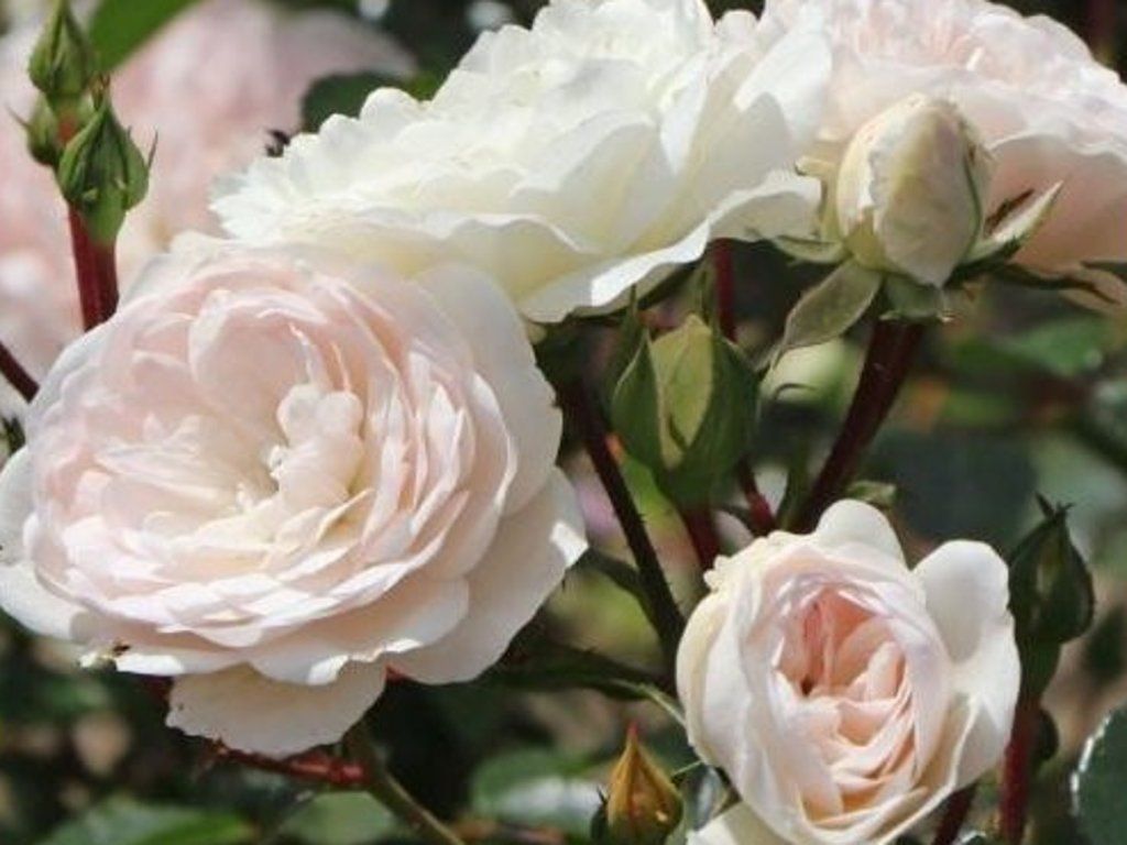 Rose 'Sea Foam' - Dichte Büsche, die sich sowohl in die Höhe als auch in die Breite um etwa 60 cm ausdehnen, bilden den Bodendecker-Kultivar Sea Foam. Sie besticht durch kleinere, volle Blüten in Weiß mit einem leichten Hauch von Rosa. Die Blüten erscheinen wiederholt im Zeitraum von Juni bis September. Die Blätter sind glänzend, tiefgrün.