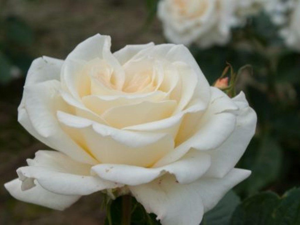 Rose 'True Love' - reichblühender, großblumiger Teehybrid. Wird bis zu 90 cm hoch. Sie hat schlanke, längliche Knospen von weißer Farbe, oft mit einem rötlichen Schimmer, die sich zu 12 cm breiten Blüten von cremeweißer Farbe entwickeln. Diese duften ebenfalls sehr angenehm. Sie eignet sich zum Schnitt.