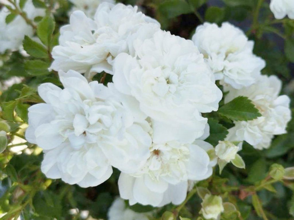 Rose 'White Fairy' - beliebte Bodendeckerrose mit kleinen, vollen Blüten in reinweiß, die vom Frühsommer bis zu den ersten Frösten in großer Zahl blühen. Die Blüten sind in reichen Dolden angeordnet und erneuern sich während der gesamten Vegetationsperiode, wobei ihr zarter Anblick mit dem dunkelgrünen, glänzenden Laub kontrastiert. Der Strauch erreicht eine Höhe von ca. 50–70 cm, wächst breitbuschig, leicht überhängend und zeichnet sich durch eine ausgezeichnete Widerstandsfähigkeit gegen Krankheiten und ungünstige Bedingungen aus. Sie benötigt keinen regelmäßigen Schnitt, was sie zur idealen Wahl für natürliche Pflanzungen, Beeteinfassungen, Hänge, Kaskaden oder größere Behälter macht. Sie wird für ihr romantisches Aussehen, ihre reiche Blüte und ihre Fähigkeit, Flächen schnell mit dichtem, niedrigem Bewuchs zu bedecken, geschätzt.