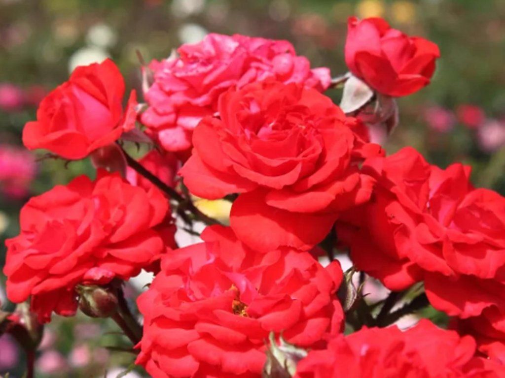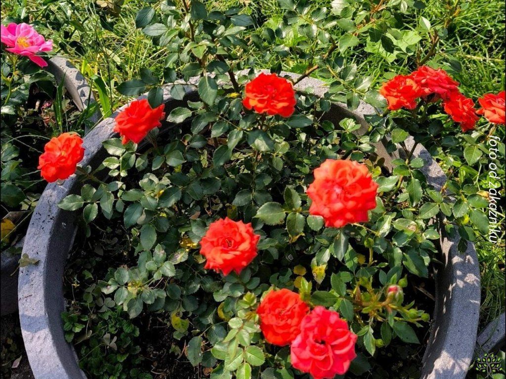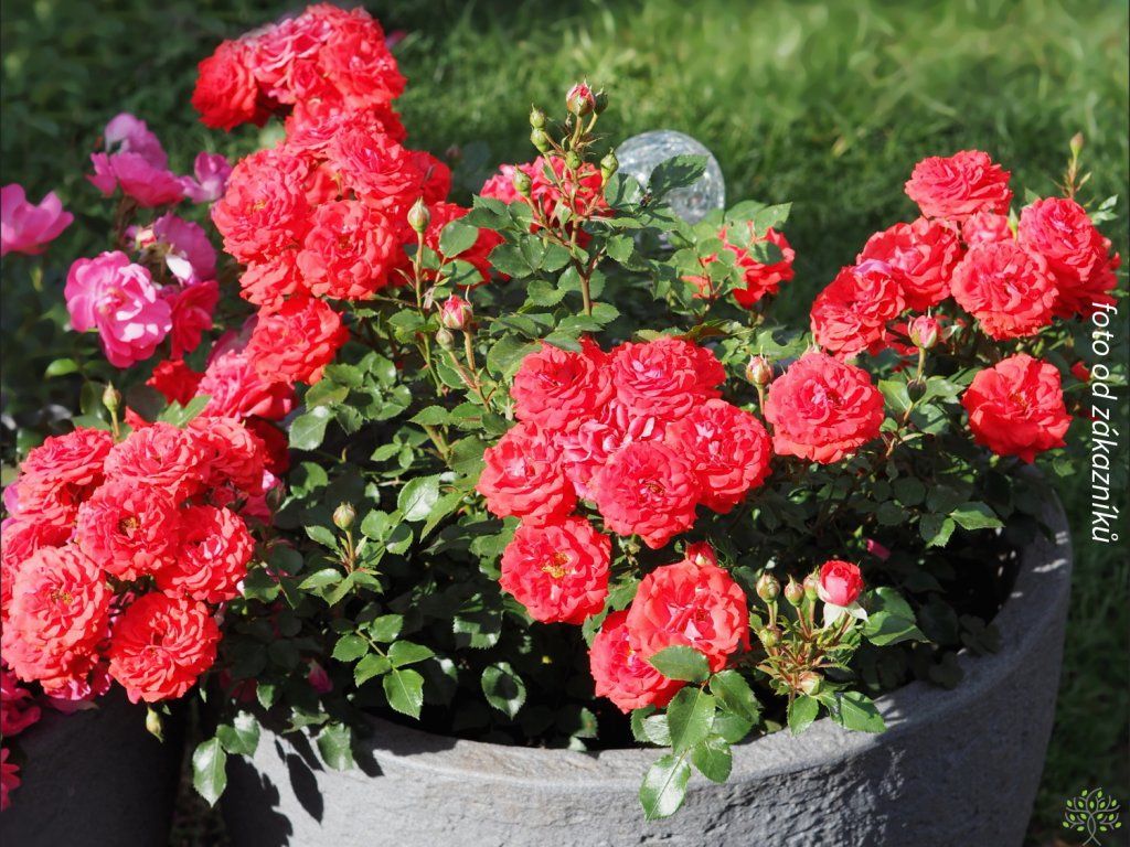 Rose 'Zwergenfee®' - eine Polyantha-Zwergrose, die nur 40 cm hoch wird und niedrige Büsche bildet. Sie blüht leuchtend rot, mit kleinen, gefüllten Blüten, die remontierend von Juni bis November erscheinen. Sie wächst langsam, eher ausladend und bildet wunderschöne Bodendecker. Sie zeichnet sich durch hohe Widerstandsfähigkeit gegen Frost und Krankheiten aus und benötigt keine chemische Behandlung. Sie kommt in verschiedenen Behältern wunderschön zur Geltung.