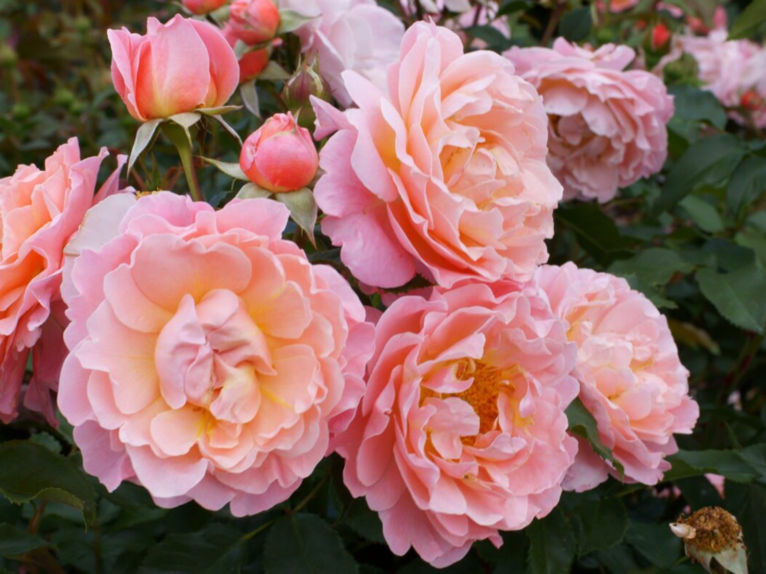 Vielseitige Schönheiten, die dichte, aufrechte Büsche bilden (normalerweise 1–1,5 m hoch). Sie eignen sich als Solitäre im Rasen oder in gemischten Staudenbeeten. Oft zählen wir hier auch die sogenannten „englischen Rosen“ mit ihrer altmodischen Blütenform dazu.
