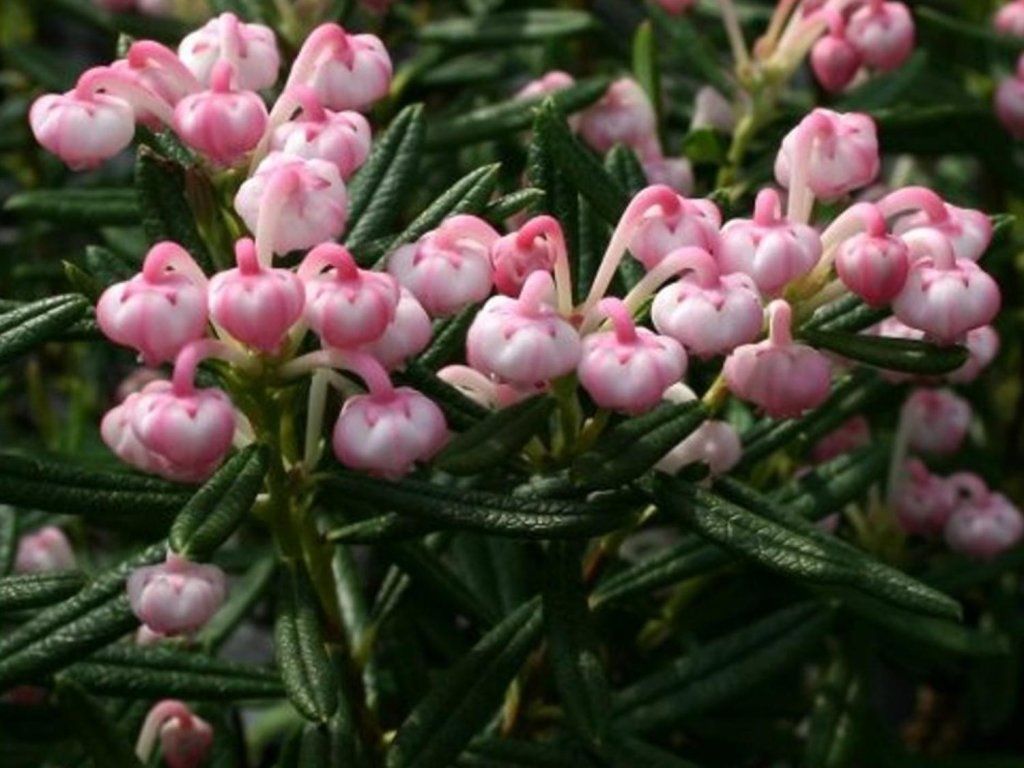 Rosmarinheide 'Compacta' - sehr schöner, zwergartiger Strauch mit kompaktem Wuchs. Sie erreicht eine Höhe von 40-60 cm. Ihre schmalen, immergrünen Blätter sind dunkelgrün, rosmarinähnlich und haben einen zart blaugrünen Schimmer. Die Wuchsform des Strauches ist sehr dicht und bildet ein ordentliches Kissen. bildet ein ordentliches Kissen. Von Mai bis Juni ist sie buchstäblich übersät mit kleinen, rosa, glockenförmigen Blüten. Eignet sich für alle Heidegarten-Kompositionen. Er ist sehr gut frostbeständig.