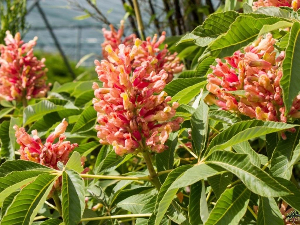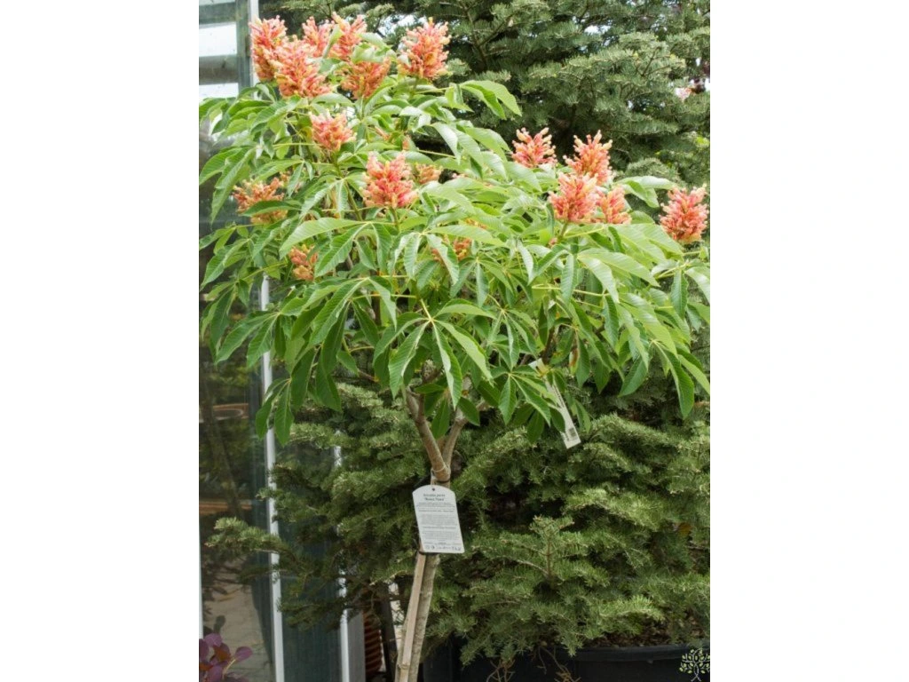 Aesculus pavia 'Rosea Nana' - ein laubabwerfender, sehr zwergwüchsiger Strauch, der eine Höhe von ca. 2 m erreicht. Er ist kugelförmig. Die Blätter sind gegenständig, 5- bis 7zählig, der Blattrand ist gesägt. Die Blütenstände sammeln sich in aufrechten Trauben und sind überwiegend rosa mit einem gelben Einschlag. Er trägt sehr selten Früchte. Die Sorte ist relativ resistent gegen die Rosskastanienminiermotte. Es handelt sich um eine sehr interessante Sorte, die als Bonsai geformt oder einfach als bezaubernder Solitär gepflanzt werden kann, der in jeden Garten passt.