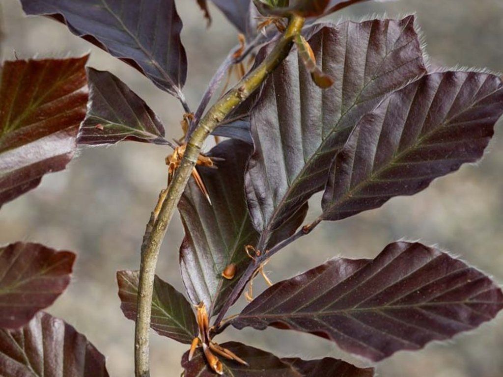 Rotbuche 'Dawyck Purple' - ein beeindruckender Baum mit einer schmalen, säulenartigen Form, der sich im Alter zu einer engen Kegelform verjüngt und eine Höhe von 15–20 Metern und eine Breite von 3 Metern erreicht. Sein frühlingshaftes Laub ist stets auffallend weinrot und bildet einen dramatischen Kontrast in der Landschaft. Im Sommer dunkelt er zu rotbraun nach und bei geringem Sonnenlicht können die unteren Blätter grün werden. Die Blätter von 'Dawyck Purple' sind rot bis violett, besonders im Frühling, wenn der Baum zum Leben erwacht. Im Sommer nehmen sie einen dunkleren Farbton an, was für eine interessante Farbdynamik sorgt. Diese Blätter sind bis zu doppelt so groß wie die der gewöhnlichen Rotbuche, leicht glänzend und verleihen dem Garten einen Hauch von Luxus und Eleganz. Die Sorte stammt aus den Niederlanden, wo sie 1968 gezüchtet wurde. Für eine zuverlässige Färbung wird empfohlen, 'Dawyck Purple'-Buchen an sonnigen Standorten zu pflanzen, wo sie ihr Farbverwandlungsvermögen voll entfalten und den Betrachter zu jeder Jahreszeit bezaubern können. Alles in allem ist die 'Dawyck Purple'-Buche eine ausgezeichnete Wahl für diejenigen, die einen Baum mit einer ausgeprägten Form und Farbe suchen, der dem Garten ein raffiniertes und bezauberndes Element verleiht.