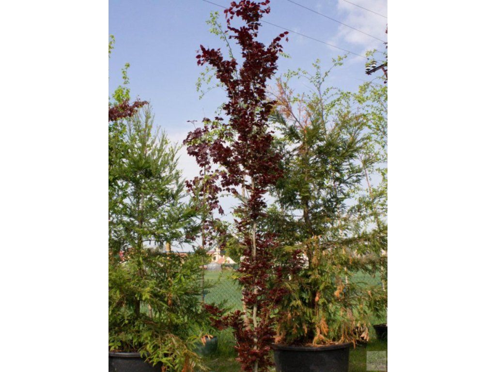 Rotbuche 'Rohan Obelisk' - ein eleganter Baum, der Ihrem Garten eine markante säulenförmige Form und beeindruckende, weinrote Blätter verleiht. Mit dieser Sorte können Sie folgende Hauptmerkmale erwarten. Seine attraktiven weinroten Blätter sind besonders im Frühling auffällig, wenn sie in frischen Tönen dieser Farbe austreiben. Im Laufe des Sommers dunkeln die Blätter allmählich zu einem tiefen Weinrot bis Braunrot nach und bilden einen Kontrast zur übrigen grünen Vegetation im Garten. Der Rohan Obelisk zeichnet sich durch sein streng säulenförmiges Wachstum aus, was ihn zu einem eleganten und markanten Element im Gartendesign macht. Er kann regelmäßig geschnitten werden, um seine säulenförmige Form zu erhalten und dichter zu werden, was besonders in kleineren Gärten von Vorteil ist. Diese Buchensorte ist anspruchslos an den Boden und verträgt verschiedene Bodentypen, von leicht sauer über neutral bis leicht alkalisch. Für eine optimale Blattfärbung wird ein sonniger Standort empfohlen. Der Rohan Obelisk ist ein Baum mit individuellem Charakter, der Ihrem Garten Eleganz, Farbe und Struktur verleiht.