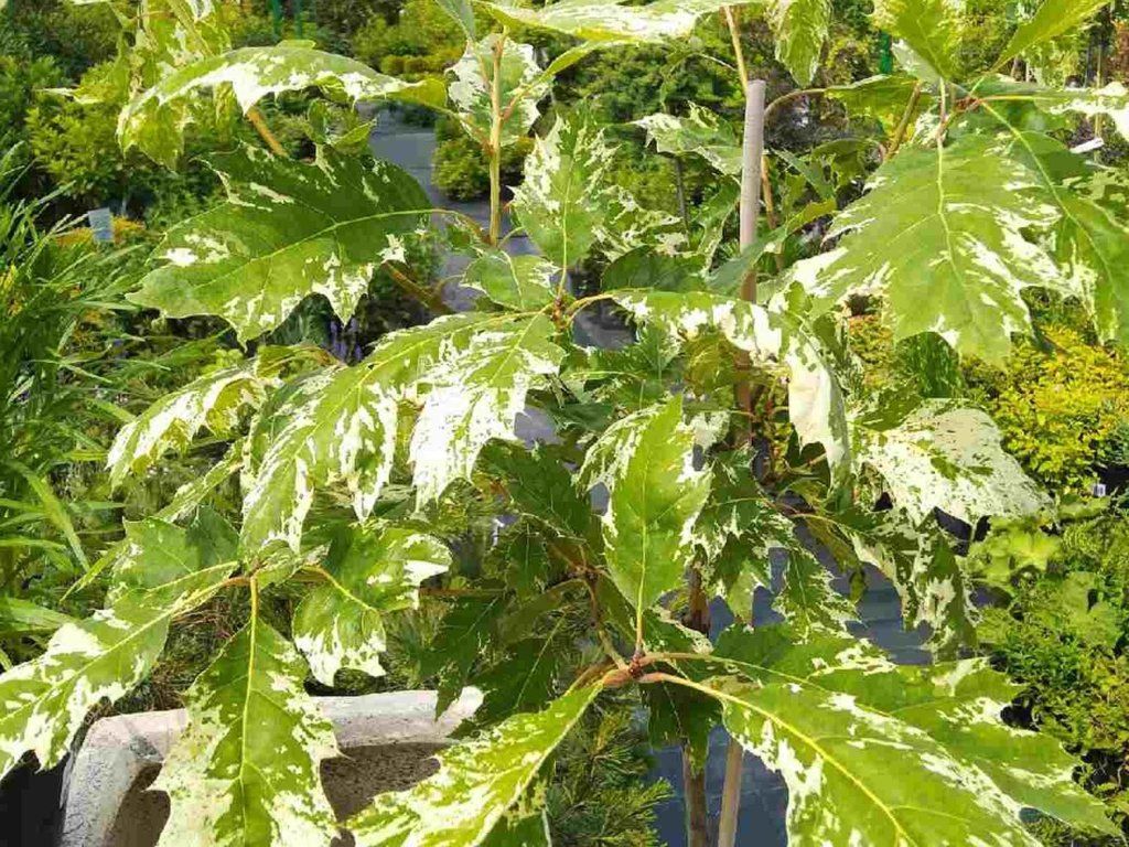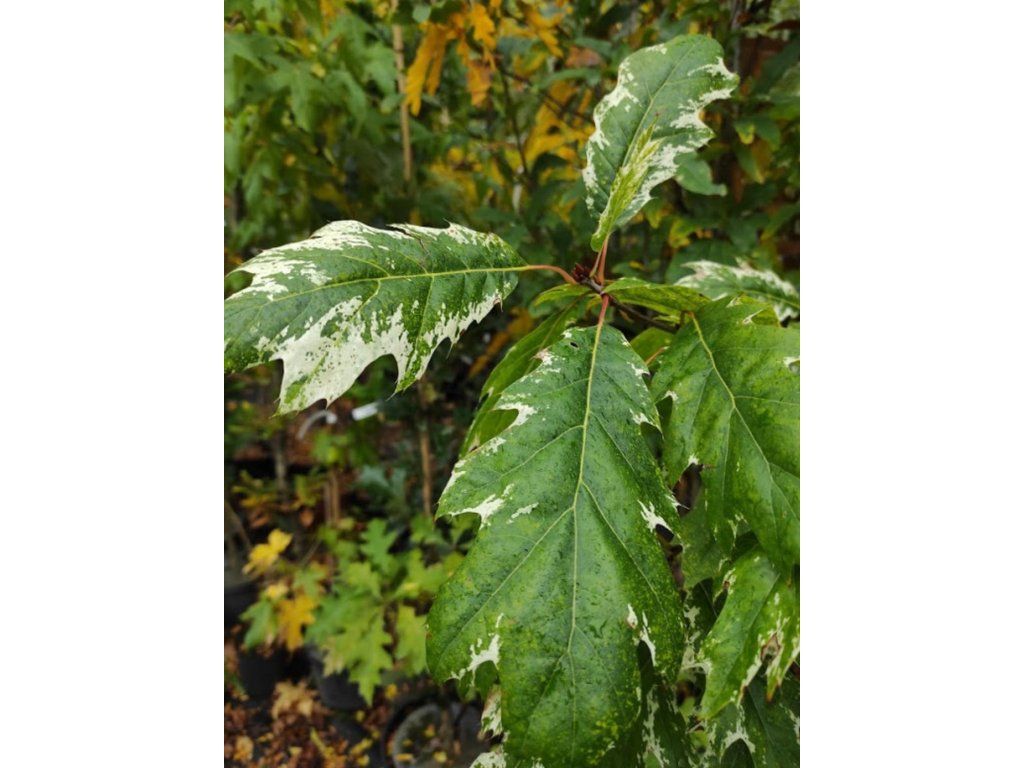 Roteiche 'Wolfsdonk's Pride' - die Sorte 'Wolfsdonk's Pride' besticht durch eine ungewöhnliche Blattzeichnung, die in der Jugend rotbraun bis karminrot mit cremefarbener Umrandung ist und sich im Sommer zu dunkelgrün mit weißer Marmorierung oder feiner Sprenkelung wandelt. Die Blätter sind meist groß, oft 15–25 cm, mit variabler Form und 3–5 Lappen in der oberen Blatthälfte. Die Krone ist jung breit kegelförmig, später kugelförmiger und kompakter, der Baum erreicht normalerweise eine Höhe von etwa 6–10 m und eine Breite von 5–8 m, sodass er auch in einen größeren privaten Garten passt. Im Frühling, April und Mai, blüht er mit unauffälligen Kätzchen, im Herbst bilden sich Eicheln, die im zweiten Jahr reifen und eine begehrte Nahrungsquelle für Vögel und Kleinwild sind. Er eignet sich hervorragend als Solitärgehölz auf Rasenflächen oder Schotterflächen, wo die panaschierte Zeichnung gut zur Geltung kommt, und auch die Kombination mit dunkelgrünen Nadelgehölzen, Buchen oder Ziergräsern ist eindrucksvoll. Die Rinde ist anfangs glatter und grau, später zerfällt sie in dunklere Platten, und die Triebe können glänzend rotbraun sein. Die Herbstfärbung reicht von scharlachrot über weinrot bis purpurrot, wobei die helle Zeichnung auf den Blättern auch in den Übergangsphasen sichtbar bleibt.
