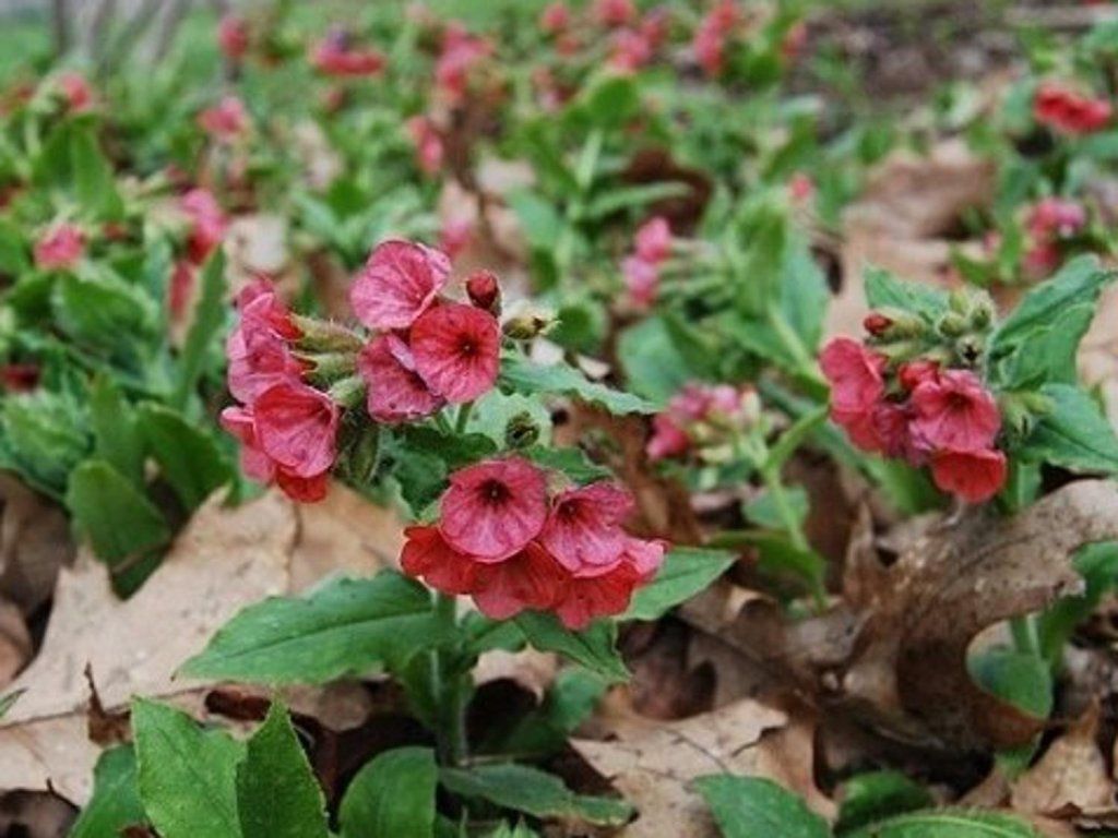 Rotes Lungenkraut - Immergrüne Lungenkrautart, bei der sich kleine Büschel korallenroter Blüten bereits mitten im Winter zeigen, obwohl die Blütezeit erst im späten Winter und frühen Frühling ihren Höhepunkt erreicht. Er ist vollkommen winterhart. Benötigt Schatten/Halbschatten und feuchten, gut durchlässigen Boden. Wird am häufigsten als Unterpflanzung unter Sträuchern verwendet.