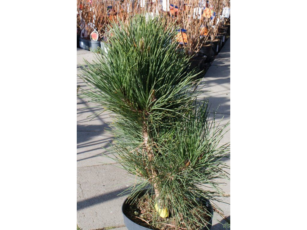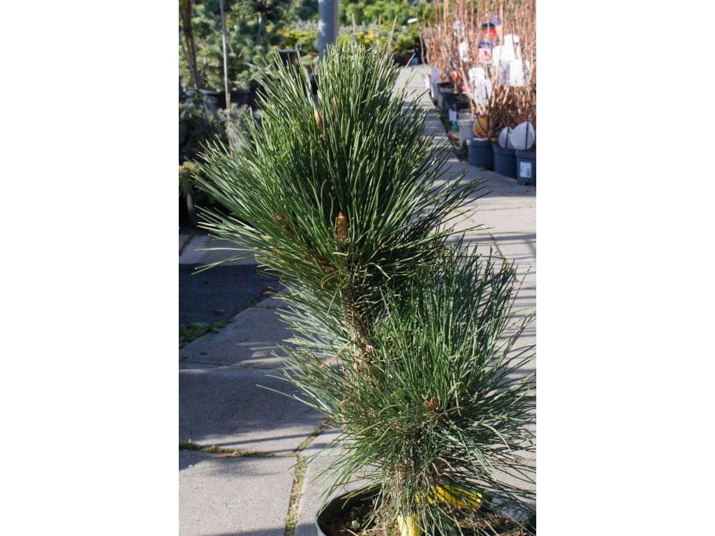 Rotkiefer 'State Trooper' - stammt aus den kälteren Regionen des nordöstlichen Nordamerikas, wo sie auf sauren, überwiegend sandigen Böden in lichten Nadelwäldern und Kiefernforsten wächst. Der Baum bildet in der Natur hohe, gerade Bäume von etwa 20–25 m Höhe mit einem schlanken Stamm und regelmäßigen jährlichen Astquirlen. Die Sorte 'State Trooper' stellt eine gärtnerische Auswahl mit einer schlankeren, kegelförmigen Krone dar, die sich für Solitärpflanzungen eignet, wo eine klare vertikale Linie und ganzjähriges Grün gewünscht ist. Die Nadeln stehen zu zweit im Büschel, sind fest, ca. 10–15 cm lang, mittel- bis dunkelgrün, bilden einen dichten Bewuchs der Äste und spenden leichten, gefilterten Schatten. Die Zapfen sind kleiner, eiförmig bis kegelförmig, etwa 4–6 cm lang, hellbraun, ohne scharfe Dornen, erscheinen einzeln oder in kleineren Gruppen. Die Rinde älterer Stämme ist auffallend rotbraun und schält sich in unregelmäßigen Plättchen ab, was dem Baum besonders im Winter dekorativen Wert verleiht. In Gartengestaltungen wird sie als Solitär auf der Rasenfläche eingesetzt, in Kombination mit Birken, Eichen oder kerzenförmigen Nadelbäumen, sie wirkt auch gut in lichten Windschutzstreifen und an naturnah gestalteten Hängen. Dank der nicht zu stacheligen Nadeln eignet sie sich auch für Familiengärten mit Kindern, wo sie Struktur und Schatten ohne scharfe Dornen bietet.
