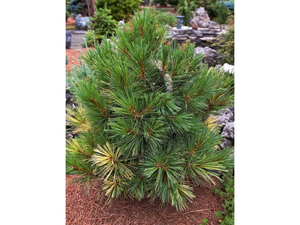 Rumelische Kiefer 'Aureovariegata' - stammt aus den Bergregionen des Balkans, wo sie in kühlerem und feuchterem Klima auf sauren und kalkhaltigen Böden wächst. Die Sorte 'Aureovariegata' ist eine panaschierte Auslese mit verlangsamtem Wachstum und einer eng kegelförmigen Wuchsform, die im Garten normalerweise etwa 2 m hoch und 1,2 m breit wird. Die Nadeln sind weich, in Fünferbündeln, 5–8 cm lang, die grundlegende blaugrüne Farbe ist unregelmäßig mit goldenen bis gelben Streifen aufgehellt. Im Frühjahr wirkt der neue Zuwachs deutlich goldener, im Sommer beruhigt sich der Kontrast zu einer grün-gelben Mosaik. Die Rinde ist braungrau, bei älteren Ästen blättert sie leicht ab. Das Wachstum ist unregelmäßig und langsam, oft etwa 10 cm pro Jahr, so dass die Form ohne regelmäßigen Eingriff kompakt bleibt. Im Erwachsenenalter können sich längliche, harzige Zapfen bilden, die nach dem Ausreifen braun werden. In Kompositionen sticht die Sorte neben dunkelblättrigen Sträuchern hervor und fügt sich gut in Heidegärten ein. Die Kiefer ist insgesamt ein schönes Element für Gärten, sie bringt ein Stück Wald in Ihren Garten.