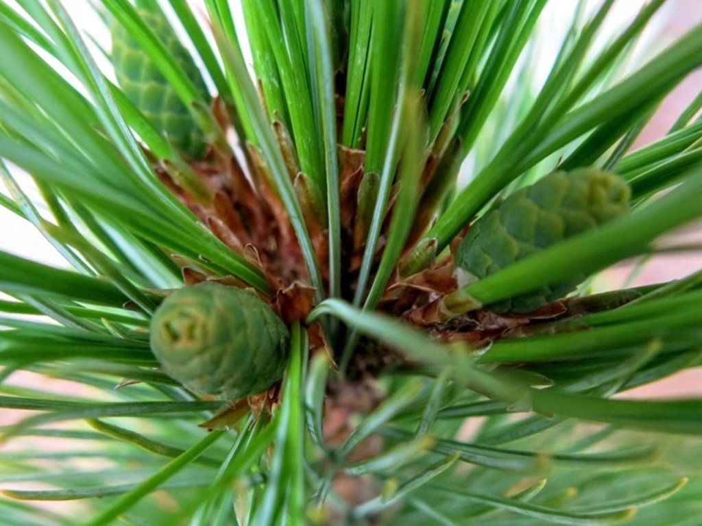 Föhre 'Bärentatze' - stammt aus den Bergregionen des Balkans, wo sie an steinigen Hängen in mittleren und höheren Lagen wächst. Der Kultivar 'Bärentatze' stellt eine kompakte, langsam wachsende Sorte mit dichter Verzweigung dar, die im Umriss einem gedrungenen Busch mit weich abgerundeten "Pfoten" ähnelt. Sie erreicht eine Höhe von etwa 1,5 m und eine Breite von 1,2 m, der jährliche Zuwachs beträgt etwa 8–10 cm. Die Nadeln sind zu fünft angeordnet, 6–8 cm lang, weich im Griff, matt blaugrün, in der kälteren Jahreszeit manchmal mit einem feinen bläulichen Schimmer. Das Nadelwerk verströmt bei Berührung einen zarten harzigen Duft, typisch für Bergkiefern. Die Krone ist dicht und von unten gut belaubt, das Gehölz wirkt das ganze Jahr über voll. Männliche und weibliche Blütenstände erscheinen im Mai bis Juni, sie sind unauffällig, gelblich bis rötlich, auffälliger sind die zylindrischen Zapfen von 8–10 cm Länge, die im zweiten Jahr reifen. Dank des weichen Nadelwerks und des gemäßigten Wuchses eignet sich 'Bärentatze' für kleinere Gärten, Vorgärten, Heidegärten und als immergrünes Element an der Terrasse. Sie lässt sich gut mit niedrigeren Wacholderarten, Zwergmispeln, Steingartenstauden oder Heidekraut kombinieren, wo die blaugrüne Farbe der Nadeln ihre Blüten und Herbstfarben hervorhebt.