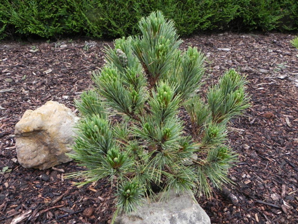 Bosnische Kiefer 'Latgale' - leitet sich von der Art Bosnische Kiefer ab, die aus den Bergregionen des Balkans stammt, insbesondere aus den Gebirgen Pirin, Rila und Šar planina. In der natürlichen Umgebung wächst sie als hoher Baum, aber der Kultivar 'Latgale' bildet eine kompakte, eher strauchartige Wuchsform mit kugelförmiger bis breit-ovaler Gestalt. Unter mitteleuropäischen Bedingungen erreicht sie nach 10–15 Jahren eine Höhe von etwa 1–1,5 m und eine Breite von 0,8–1,2 m, das Wachstum ist langsam und regelmäßig. Die Nadeln sind weich, in Fünferbündeln, 6–9 cm lang, mattgrün mit einem feinen bläulichen Schimmer, was der Pflanze einen ruhigen, kühlen Ton verleiht, der gut zu grauen Steinen oder silbrigen Gräsern passt. Junge Zapfen erscheinen bereits an relativ niedrigen Pflanzen, weibliche sind anfangs purpurfarben, werden später braun und bilden längliche Zapfen von etwa 8–10 cm Länge. In der Komposition kommt sie als Solitärpflanze im Vorgarten, in Heidegärten oder in Kombination mit niedrigen Wacholderarten, Heidekraut, Pieris und Ziergräsern zur Geltung. Dank ihres ruhigen Ausdrucks eignet sie sich auch für japanisch gestaltete Gärten und kleinere Stadtgärten.