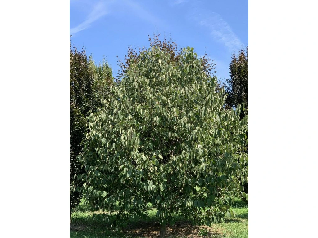 Rundblättriger Storax - mittelhoher Baum oder Strauch mit einer breiten, eiförmigen bis runden, halboffenen Krone. Er erreicht eine Höhe von 10-15 m, je nach Wachstumsbedingungen. Aromatische, reinweiße Blüten mit gelben Stempeln erscheinen im Juni und wachsen horizontal oder in einer leicht überhängenden Traube. Junge Zweige sind rotbraun, anfangs behaart, später dunkeln sie zu einem tiefen Violett nach und sind leicht schuppig. Dunkelgrüne Blätter haben eine runde Form, die in einer auffälligen Spitze endet. Die beiden untersten Blätter jedes Triebs stehen praktisch gegenüber, die anderen sind entlang des Zweiges verteilt. Die Blüten werden anschließend durch harte weiß-gelbe Früchte ersetzt. Er eignet sich als Solitär in jedem Garten.