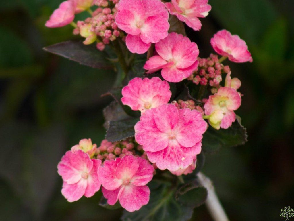 Sägeblatt-Hortensie 'DareDevil' – ein Strauch aus den Bergregionen Japans und Koreas, geschätzt für seine zarten Tellerblüten und eine bessere Knospenresistenz als viele Bauernhortensien. Die Sorte ‘Daredevil’ wurde vom französischen Züchter Jean-Paul Davasse gezüchtet und 2021 mit einem Patent in den Verkauf gebracht. Die Pflanze bildet aufrechte, steife Triebe und auffallend dunkle Blätter in mahagoni-weinroten bis burgunderroten Tönen, die sich im Herbst zu Rot verfärben. Von Juni bis September erscheinen flache Blüten mit einem Durchmesser von etwa 8–12 cm, in der Mitte mit kleinen fertilen Blüten und am Rand mit größeren Hochblättern in einer rosa-violetten Skala; ein ausgeprägter Duft ist normalerweise nicht vorhanden. Der Strauch erreicht eine Höhe von etwa 0,5–0,8 m und eine Breite von 1,0–1,2 m, sodass er sich gut als Solitär, in einer kleineren Gruppe oder in einem größeren Kübel eignet. In der Komposition bewährt er sich mit Funkien, Farnen, Purpurglöckchen oder säureliebenden Sträuchern, wo das dunkle Laub einen ruhigen Hintergrund bildet. Die Blüten liefern Pollen und Nektar für Bestäuber, Teile der Pflanze können beim Verzehr leicht giftig sein. Insgesamt ist die Hortensie ein beliebtes Element für Gärten und verleiht jedem Garten ein zartes und romantisches Aussehen.