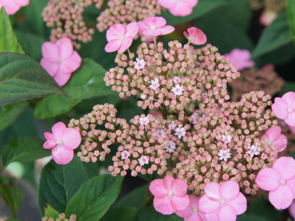 Hortensie serrata 'Oamacha' - ein breiter und aufrecht wachsender Strauch, der sich durch seinen wunderschönen Blütenstand auszeichnet. Im ausgewachsenen Zustand erreicht er eine Höhe von etwa 1,2 m. Er blüht von Juni bis den ganzen Sommer über. Die Blüten sind schirmförmig. Der innere Teil besteht aus kleinen, dunkelrosa Blüten, die Ränder bilden größere weiß-rosa gefärbte Blüten. Die Blätter verfärben sich im Herbst in weinrote Töne. Er wird gut aussehen als Solitärpflanze oder in Kombination mit anderen Hortensienkultivaren, aber auch als Solitärpflanze kommt er hervorragend zur Geltung. Insgesamt ist die Hortensie ein beliebtes Element für Gärten und verleiht jedem Garten ein zartes und romantisches Aussehen.
