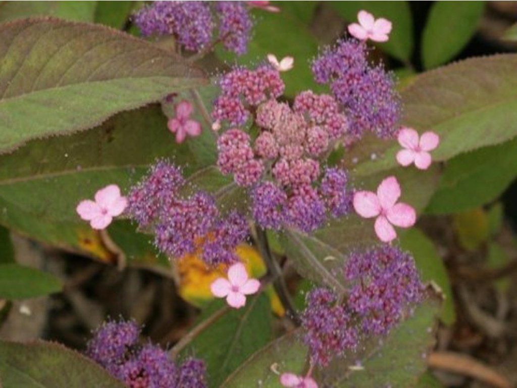 Rauhe Hortensie 'The Ditch' - eine neuere Sorte, ursprünglich aus Belgien. Im Laufe von zehn Jahren erreicht sie eine Höhe und Breite von etwa 2,5 m. Sie hat schmalere, leicht behaarte, grüne Blätter. Von Juli bis September bildet sie flache, schirmartige Blütenstände, die aus kleinen, fruchtbaren, violetten Blüten in der Mitte und größeren, sterilen Blüten in zarten Rosatönen bestehen. Dieser Strauch kommt im Garten, im Beet und auf der Terrasse hervorragend zur Geltung. Insgesamt ist die Hortensie ein beliebtes Element für Gärten oder Terrassen, das jedem Garten ein zartes Aussehen und Farbe verleiht.