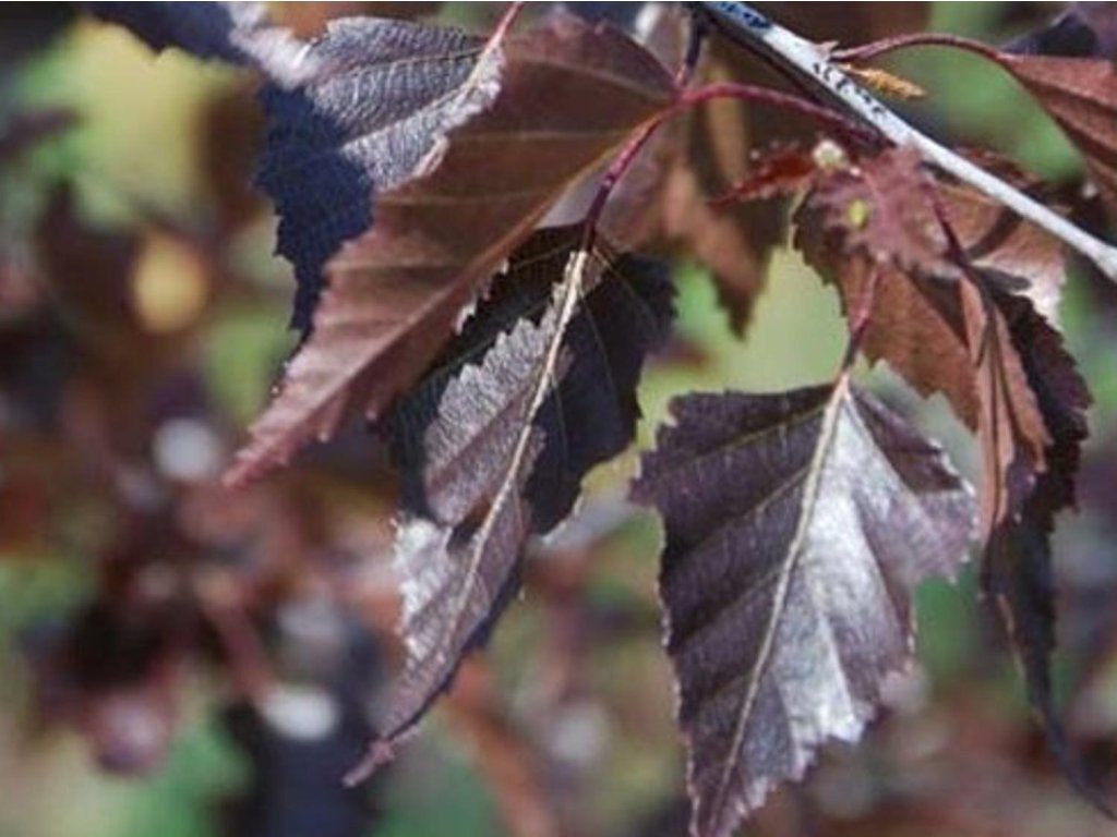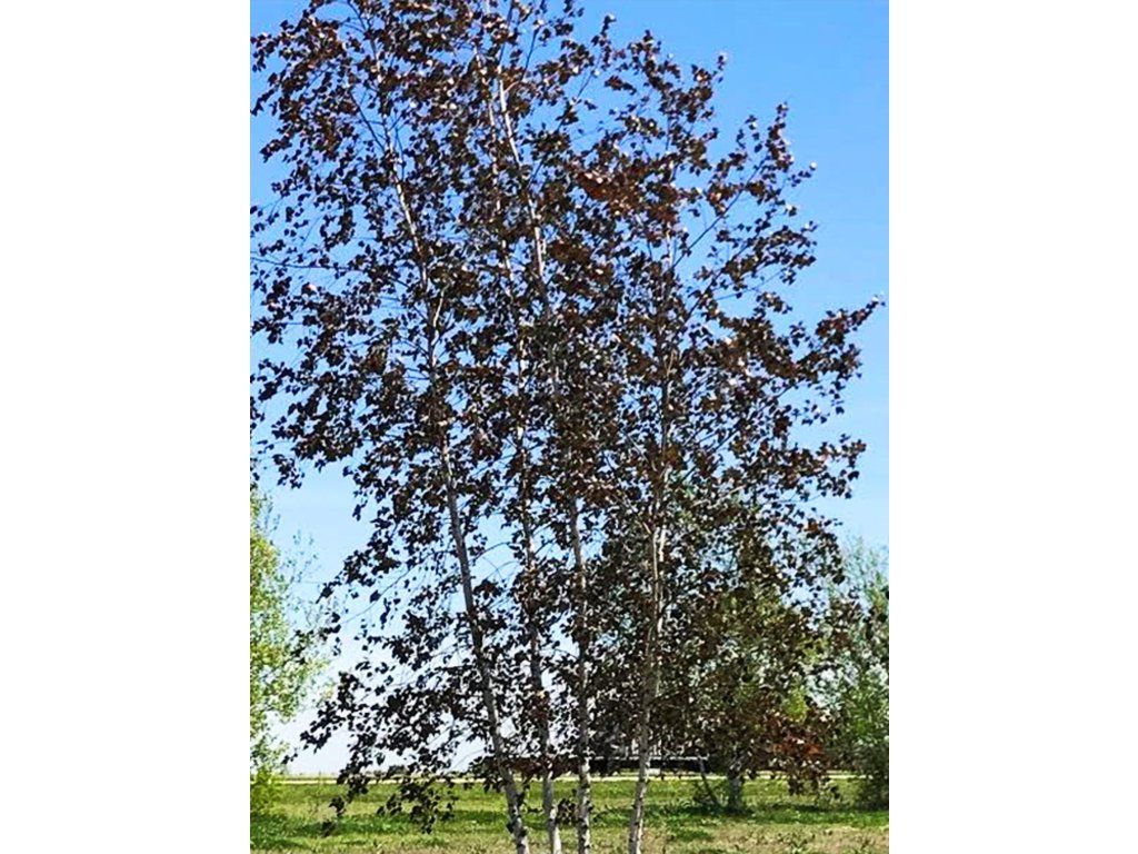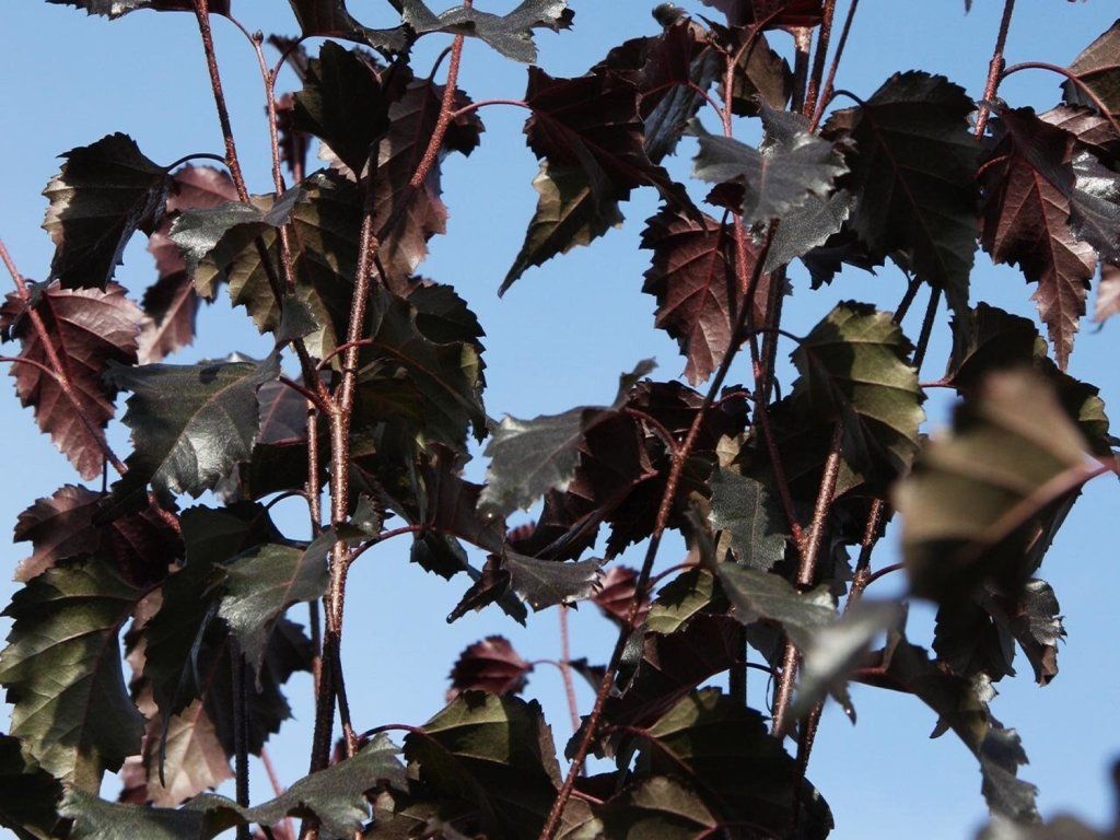 Birke 'Royal Frost' - ein ausgewählter Kultivar der Weißbirke aus Nordamerika, wo sie als farbliche Alternative zur klassischen grünblättrigen Form gezüchtet wurde. Sie zeichnet sich durch regelmäßiges, schlankes Wachstum und eine luftige Krone aus, die im Erwachsenenalter etwa 8-12 m Höhe und 4-6 m Breite erreicht. Der Stamm ist mit einer typischen weißlichen Rinde mit feiner Ablösung bedeckt, die einen Kontrast zum dunkelweinroten bis purpurnen Laub bildet. Die Blätter sind dreieckig, fein gesägt, treiben im Frühjahr mit einem ausgeprägten dunklen Farbton aus und behalten ihre Farbe während der gesamten Vegetationsperiode. Im Herbst gehen sie in rotbraune Töne über. Die Blüten bestehen aus unauffälligen Kätzchen, die im April erscheinen und eher botanische Bedeutung haben. Die Sorte wird hauptsächlich als Solitär in Gärten, Parks und städtischen Grünanlagen eingesetzt, wo sie durch ihren farblichen Kontrast zu hellen Fassaden, Rasenflächen und Nadelbäumen besticht. Sie lässt sich gut mit Ziergräsern, hellblättrigen Sträuchern oder Stauden mit feiner Textur kombinieren.