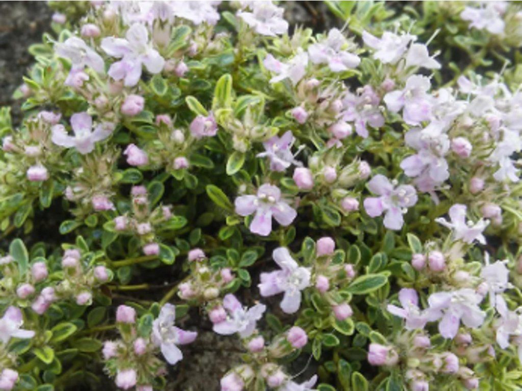 Schmalblättriger Thymian 'Highland Cream' - Thymus serpyllum ist eine natürlich vorkommende europäische Art trockener, felsiger und steppenartiger Standorte. Die Sorte 'Highland Cream' wurde wegen ihrer auffälligen cremefarbenen Panaschierung und ihres kompakten, kriechenden Wuchses selektiert. Sie erreicht eine Höhe von etwa 5-10 cm und bildet dichte Polster von 30-40 cm Breite. Die Blätter sind klein, immergrün und zart aromatisch. Von Juni bis Juli erscheinen über dem Bewuchs kleine Blüten in Schneeweiß mit einem zarten Rosaton, die in niedrigen Blütenständen angeordnet sind. Die Pflanze ist stark bienenfreundlich. Das Laub enthält aromatische ätherische Öle mit Thymol und Carvacrol, die traditionell in der Küche und Volksmedizin verwendet werden, insbesondere zum Würzen von Speisen und zur Zubereitung von Tees. In Gartengestaltungen wird es mit Fetthennen, Lavendel oder niedrigen Ziergräsern kombiniert.