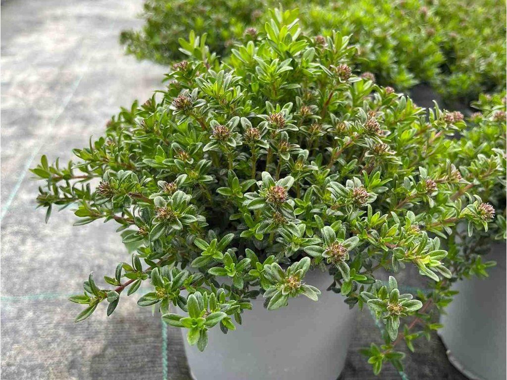 Kultivierung: Für die Kultivierung bewährt sich volle Sonne am besten, da sie kompaktes Wachstum und reiche Blüte fördert. Der Boden sollte leicht, gut durchlässig, sandig bis steinig sein, mit einem neutralen bis leicht alkalischen pH-Wert von etwa 6,5-7,5. Eine gute Drainage ist wichtig, insbesondere im Winter, wenn länger anhaltende Staunässe die Pflanzen schädigen kann. Die Bewässerung ist nach der Wurzelbildung minimal, Thymian verträgt Trockenheit sehr gut. Eine Düngung ist in der Regel nicht erforderlich, höchstens in kleinen Mengen im Frühjahr. Nach der Blüte kann der Bewuchs leicht zurückgeschnitten werden, was die Verdichtung und Beibehaltung der niedrigen Form fördert. Die Frosthärte reifer Pflanzen liegt bei bis zu -25 °C, was eine problemlose Überwinterung unter unseren Bedingungen ohne Winterschutz ermöglicht. Die Pflanzung erfolgt meist von März bis Oktober mit Abständen von etwa 20-25 cm. Dies entspricht etwa 9-12 Pflanzen pro m². Die Pflanze ist im Allgemeinen resistent gegen Krankheiten und Schädlinge und gehört zu den sehr zuverlässigen Bodendecker-Stauden.