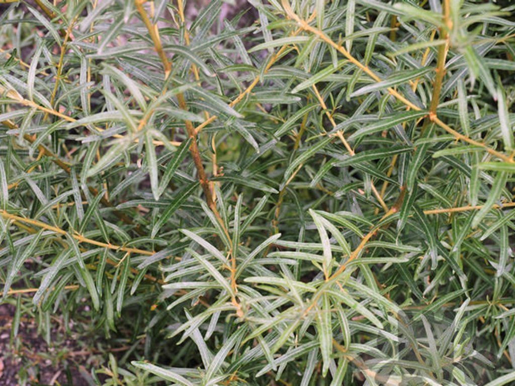 Sanddorn 'Pollmix' - eine laubabwerfende männliche Sorte, die 5 - 10 weibliche Pflanzen bestäuben kann. Diese Sorte erreicht eine Höhe von etwa 3 - 5 m. Im Frühling von März bis April blüht er mit unauffälligen weiß-grünen Blüten. Sie bildet einen unregelmäßigen, ausladenden Strauch oder einen kleinen Baum. An den dornigen Zweigen wachsen abwechselnd schmale, auf beiden Seiten blaugrüne oder silbrige Blätter.