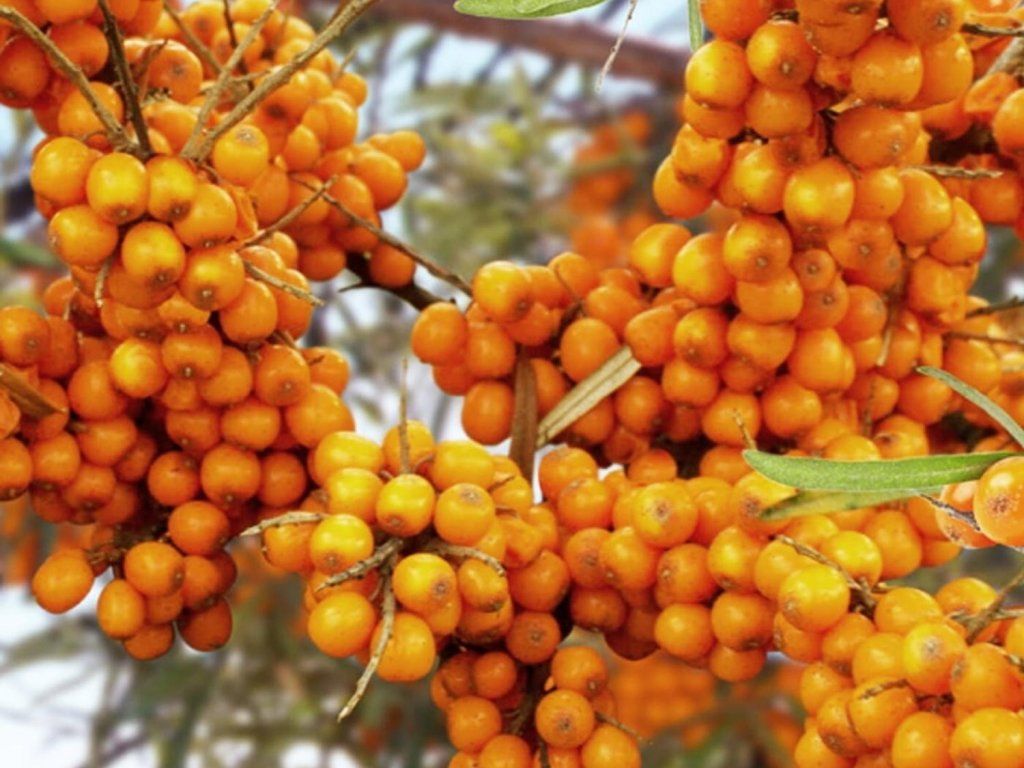Sanddorn 'Čujská' - dies ist eine weibliche Pflanze. Bildet einen niedrigen, kompakten Strauch. Wird bis zu 2 m hoch. Die Triebspitzen sind hell gelbgrün und die Basis der Triebe silbrig. Er ist fast dornenlos. Die Blätter sind hellgrün. Reift in der zweiten Julihälfte. Leuchtend orangefarbene Früchte wiegen 0,9-1 g, haben einen mittleren Stiel und sind leicht süßlich. Die Ablösung ist einfach. Für die Bestäubung und Fruchtbildung muss eine männliche Pflanze gekauft werden (bei uns unter dem Namen "Bestäuber").